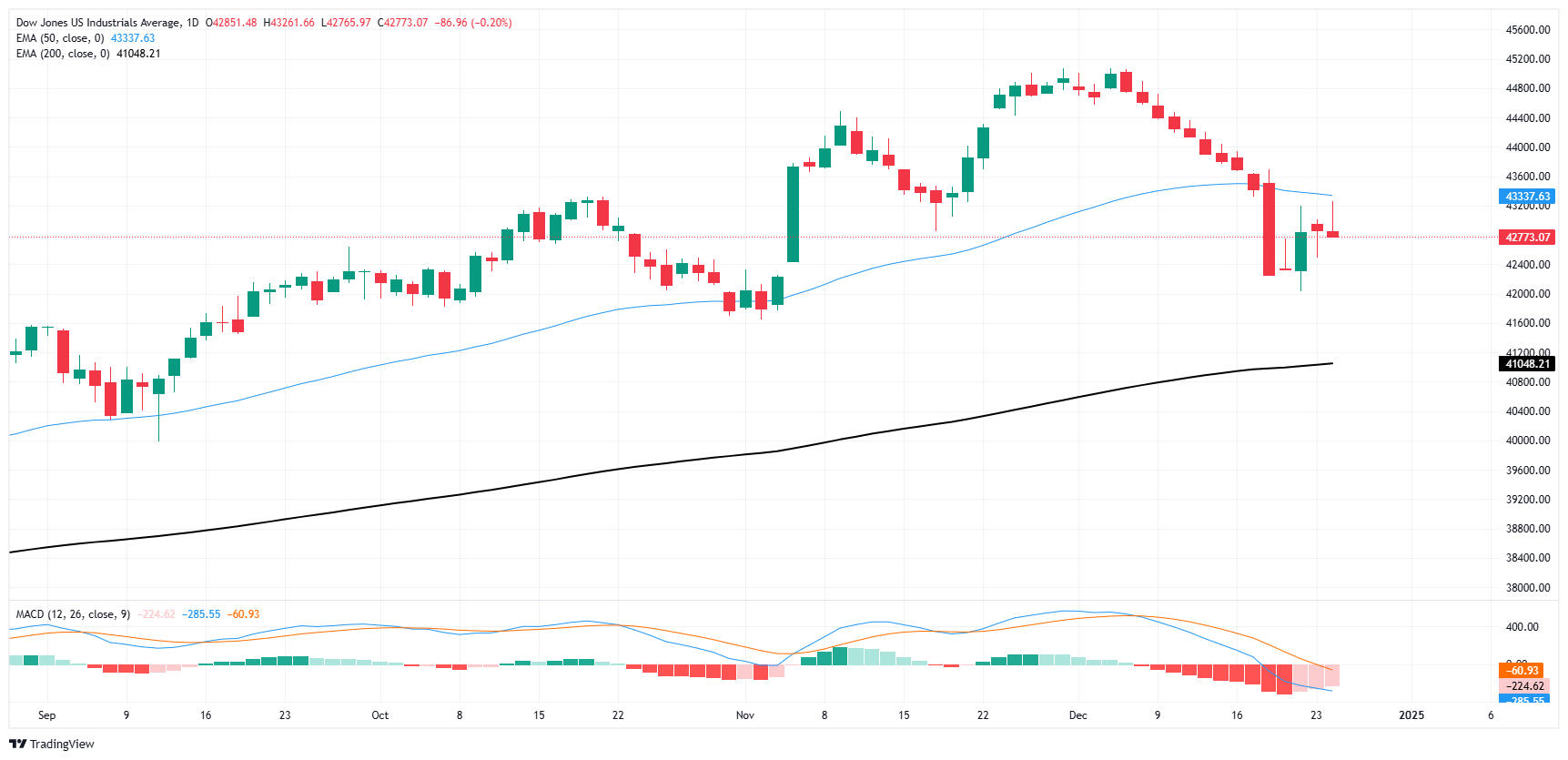 道琼斯工业股票平均价格指数(DJIA)在平静的周五下跌了约 400 点。大多数投资者仍在假期中离开市场,稀少的交易量使道琼斯股票大约下跌了整整一个百分点。