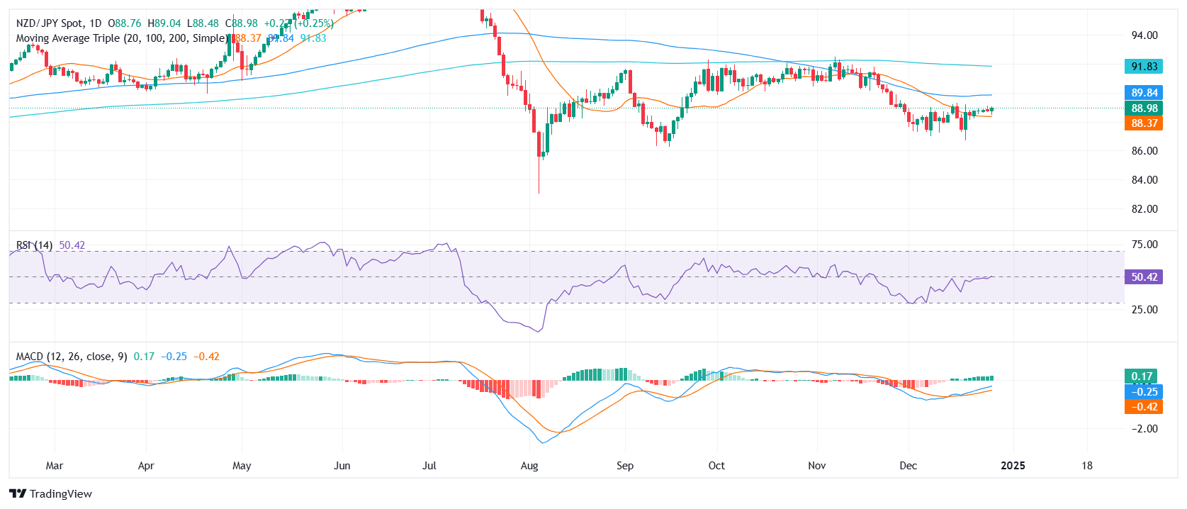纽元/日元周五小幅上涨0.20%,攀升至88.90,并在突破20日简单移动均线(SMA)后继续上涨。