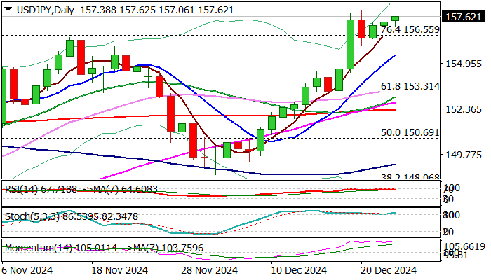 美元/日元 周四市场交投清淡,美元/日元走强,并测试上周五的高点 157.92(自 7 月中旬以来的最高点)。 美元/日元有望连续第四周上涨,12 月份月线涨幅将超过 5%。 由于预期通胀将在一段时间