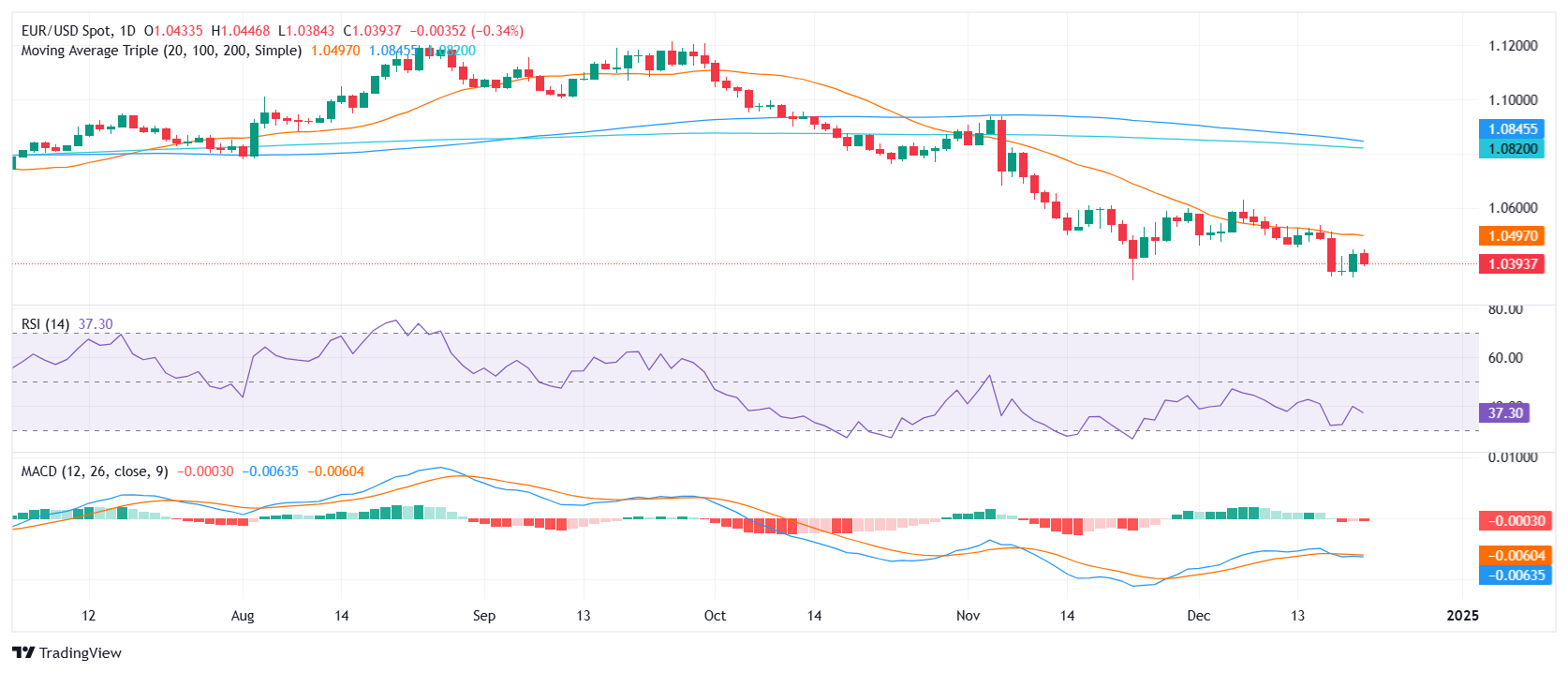欧元/美元在新交易周开盘时表现疲软,下跌0.35%,徘徊在1.0400附近。