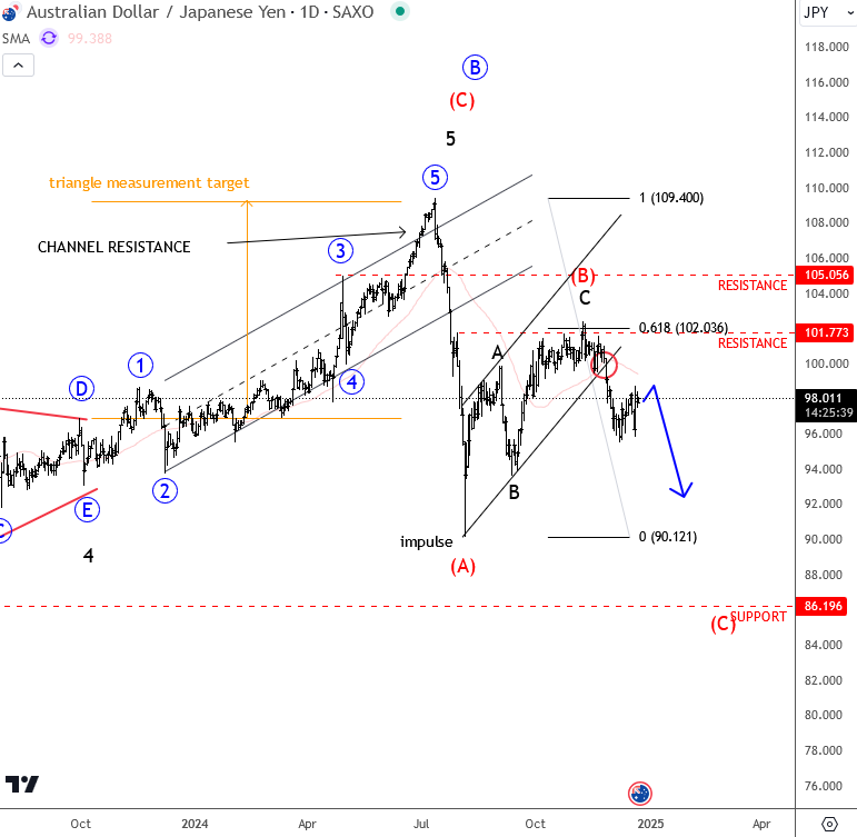 7 月份,澳元/日元对在 (A) 浪中出现大幅和冲动性下跌,这是看跌确认信号,因此我们认为 (A)-(B)-(C) 调整幅度更大,在 (B) 波中最近出现三波 ABC 调整反弹后,(C) 浪可能会出现