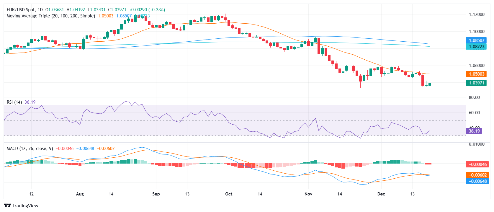 在周三遭受超过 1% 的大幅下跌后,欧元/美元在周末小幅反弹,周五上涨 0.28%,在 1.0395 附近交易。
