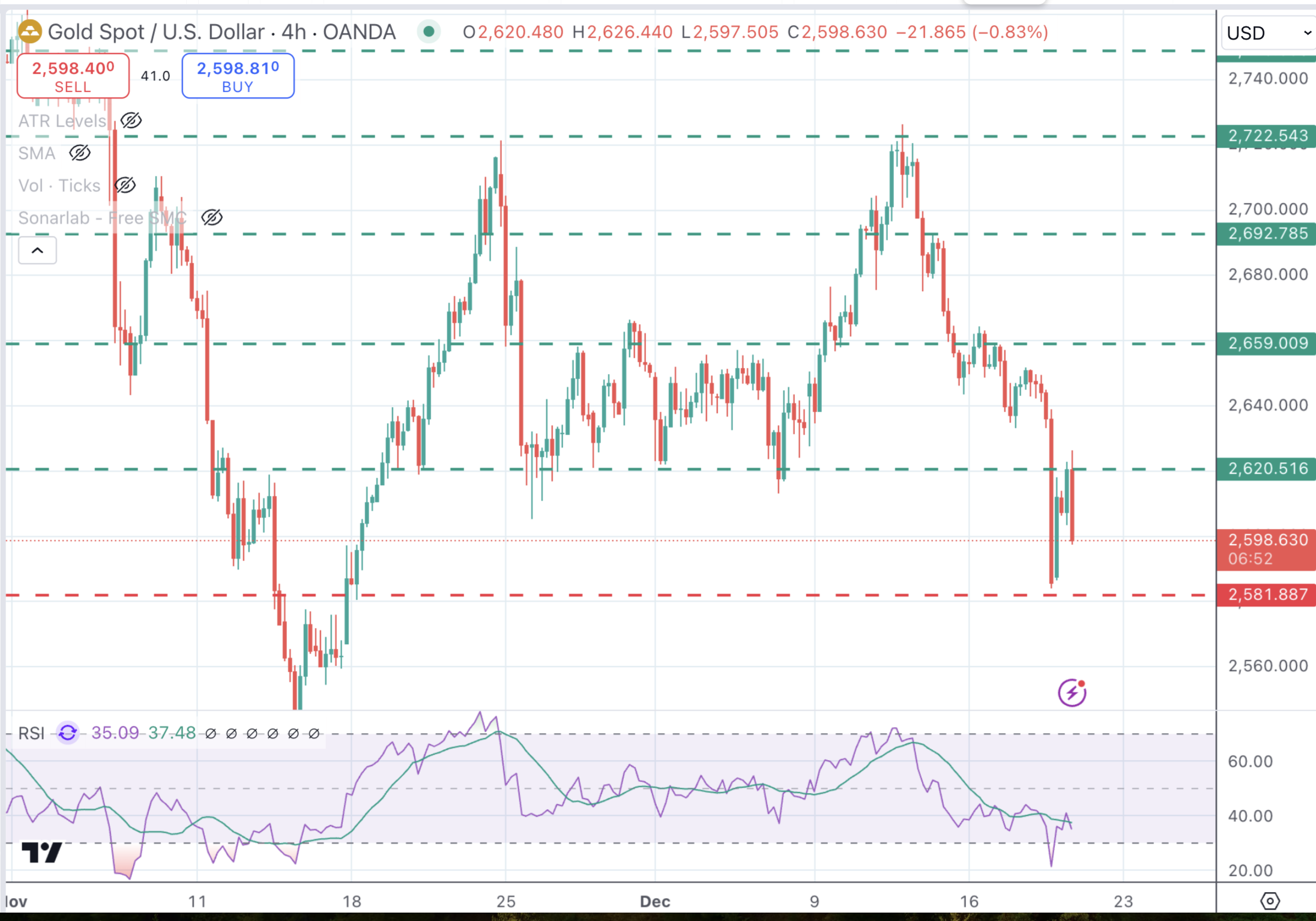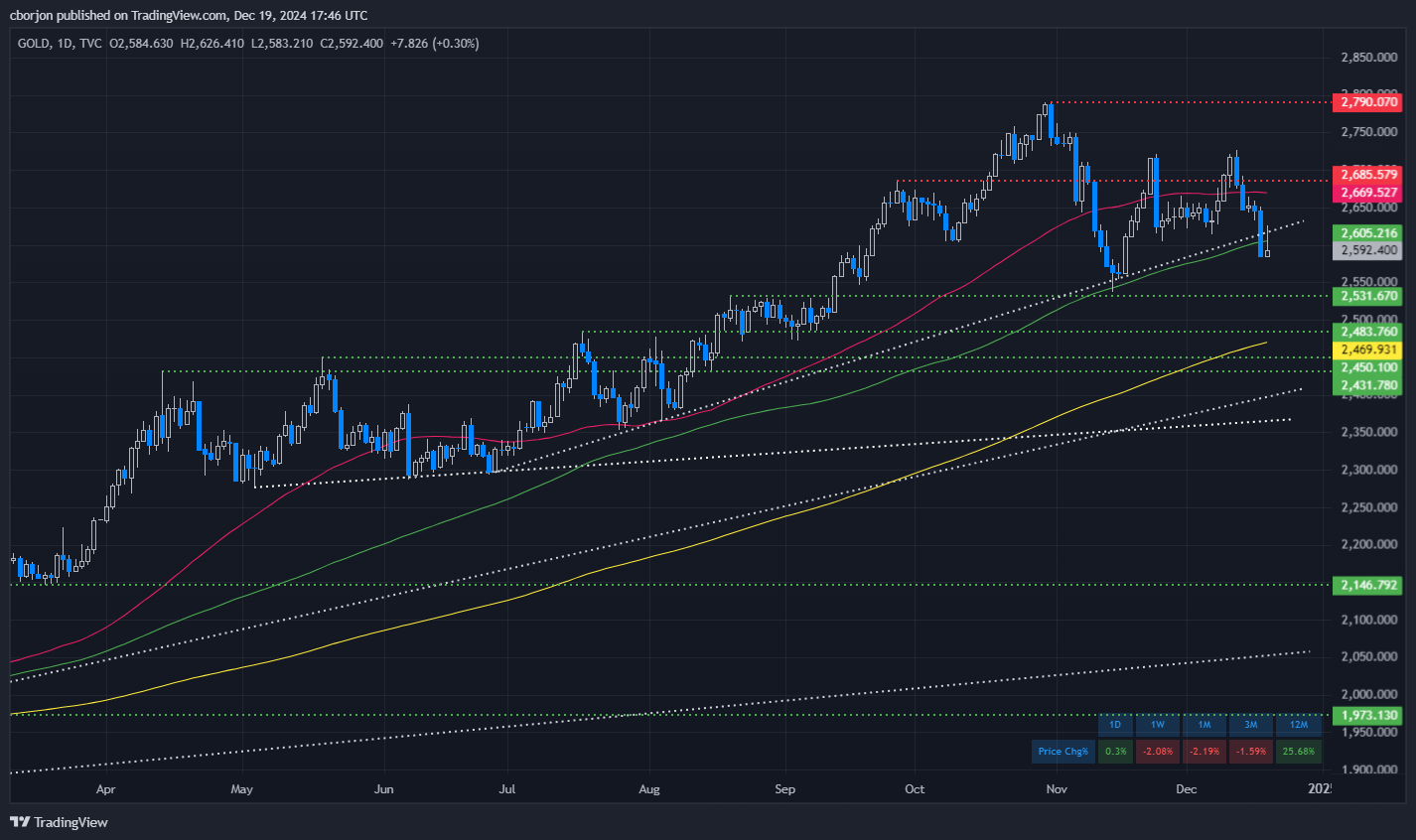金价在美国乐观数据公布后进一步从2,620美元回落