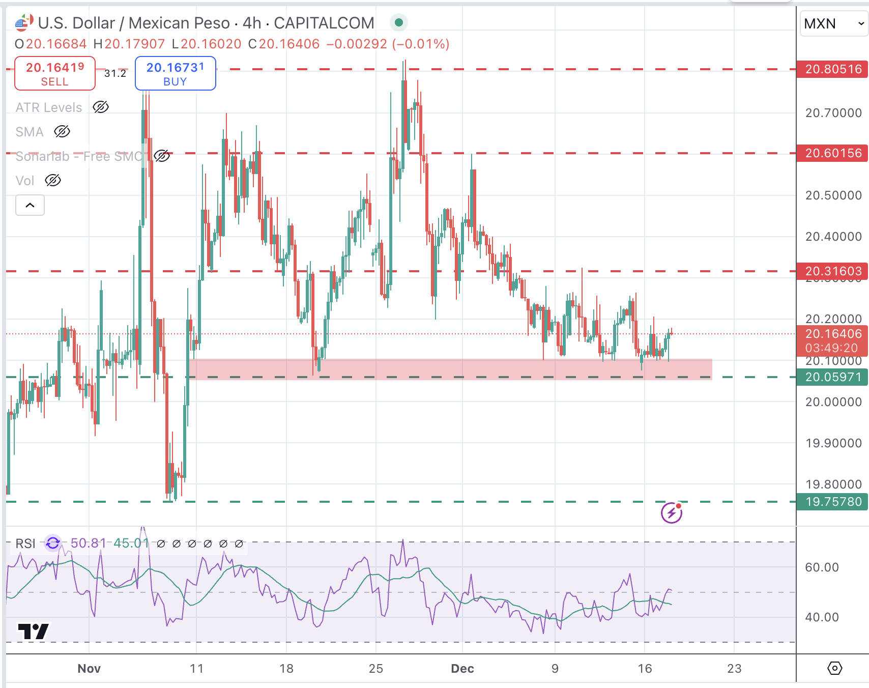 周二,墨西哥比索(MXN)在关键的 20.00 水平附近对美元(USD)区间震荡。