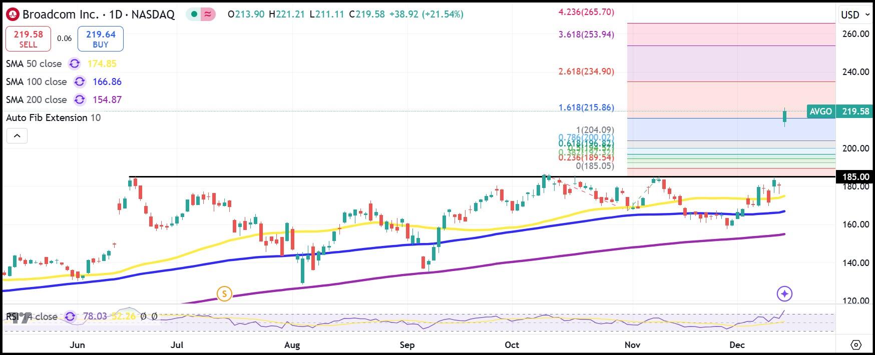 博通 (AVGO)股价上周五上午飙升逾 21%,此前该公司管理层在周四的财报电话会议上估计,到 2027 财年,定制 AI 加速器的市场规模可能达到 900 亿美元。 作为定制芯片的主要贡献者,博通股