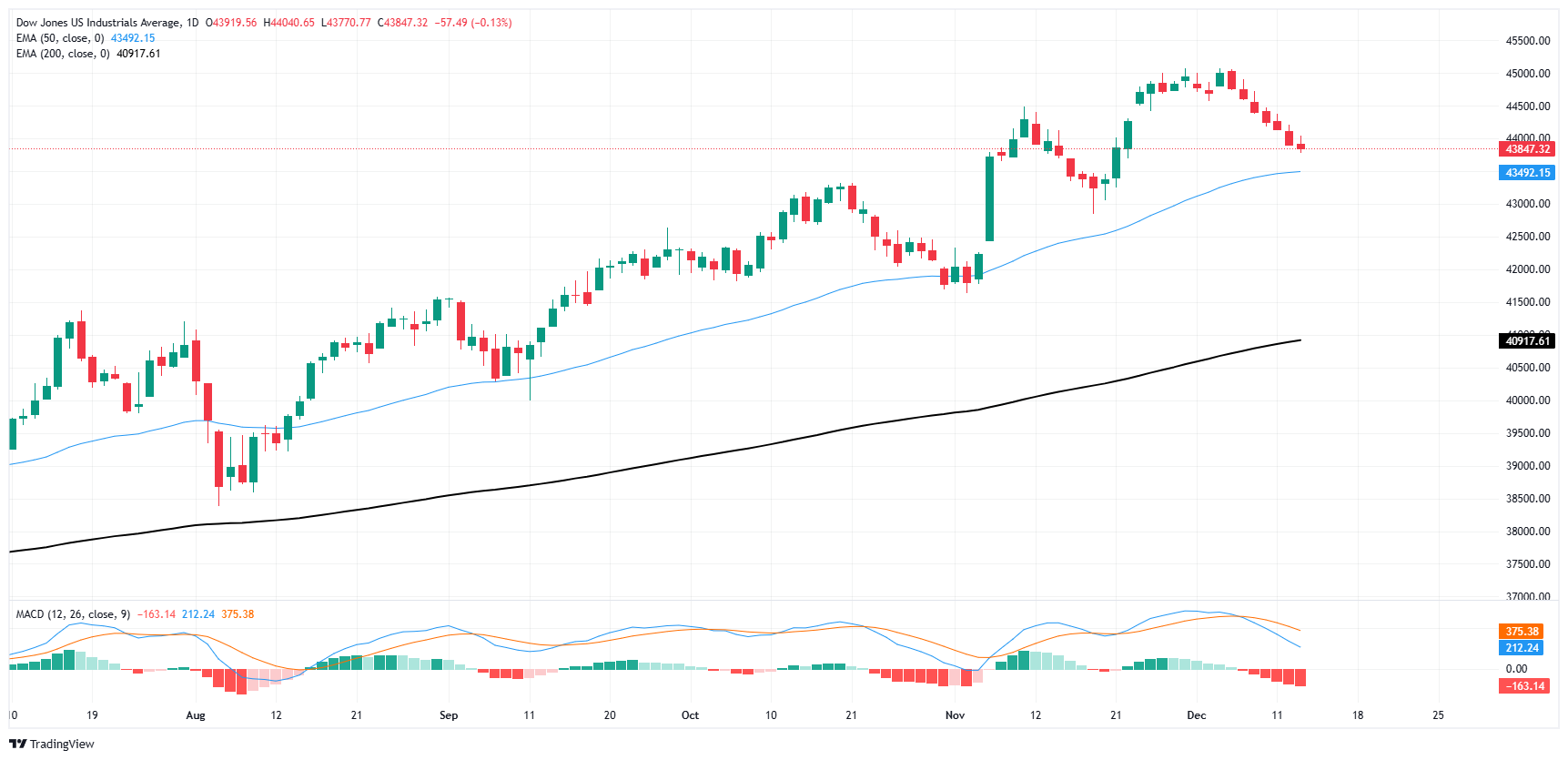 道琼斯股票指数上周五在平静市场中走软。美市盘中,经济事件属于二级事件,让投资者关注关注美联储(Fed)未来的降息步伐。道琼斯工业平均指数(DJIA)延续了近期微弱但持续的跌势,进一步跌破 44,000