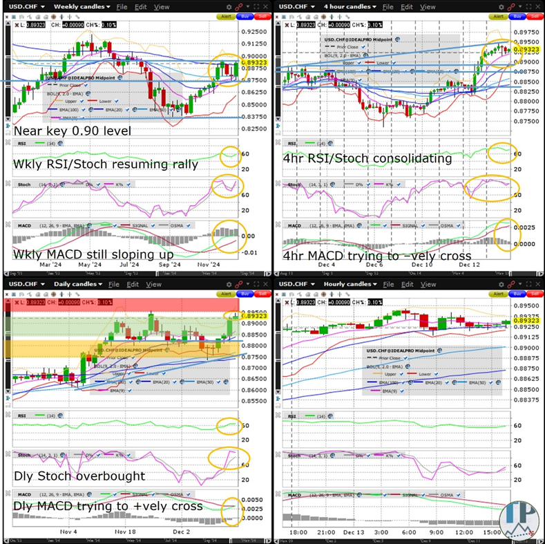 美元/瑞郎上周五小幅走高,收盘处在 11 月高点紧下方。尽管美元/瑞郎周初有望进一步盘整,但在圣诞节低迷之前,测试心理关键水平 0.90 整数关的概率目前有所上升。目前看来,12 月高点/低点可能会处