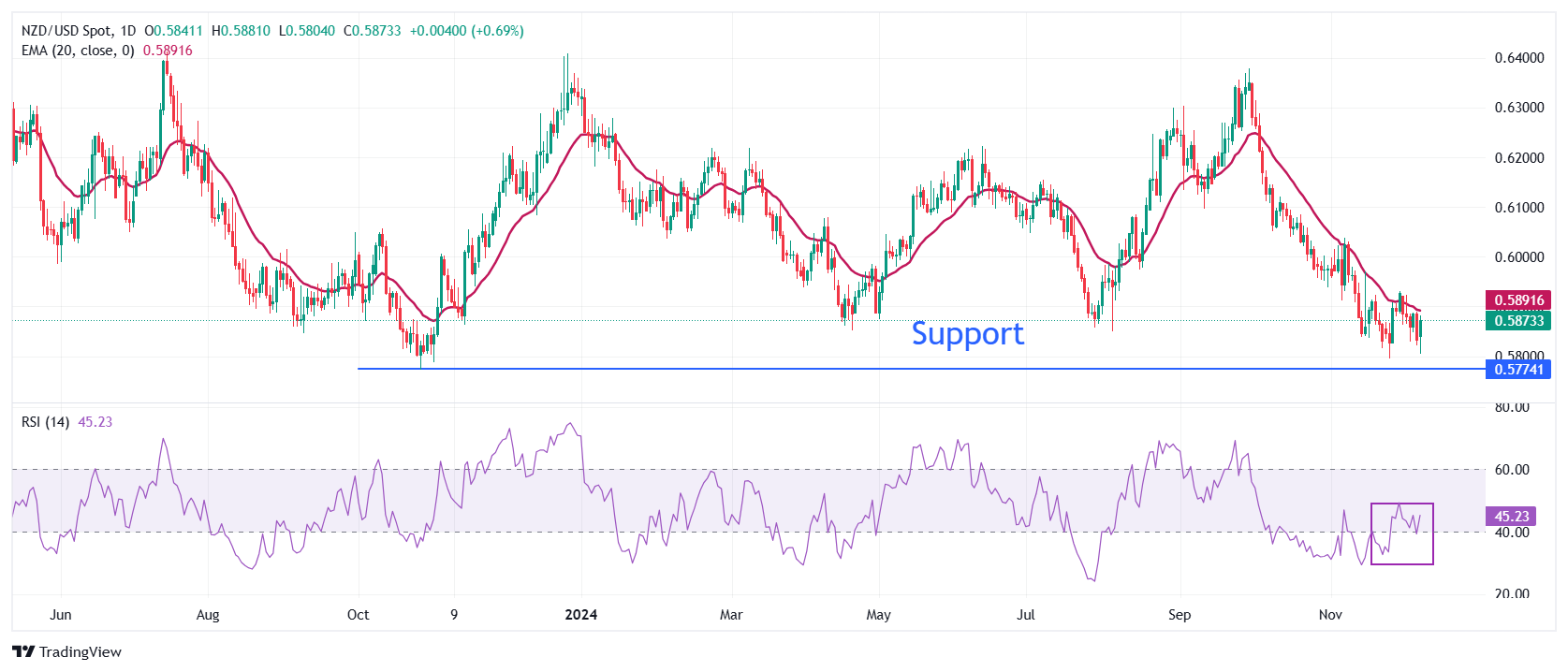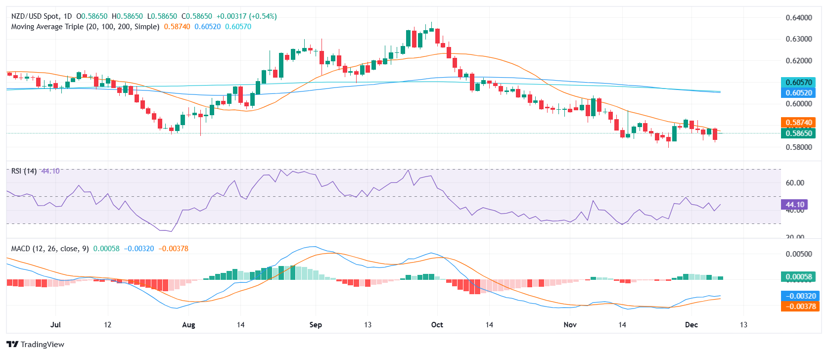 纽元/美元价格分析:上涨至 0.5860,但挣扎于 20 日均线附近