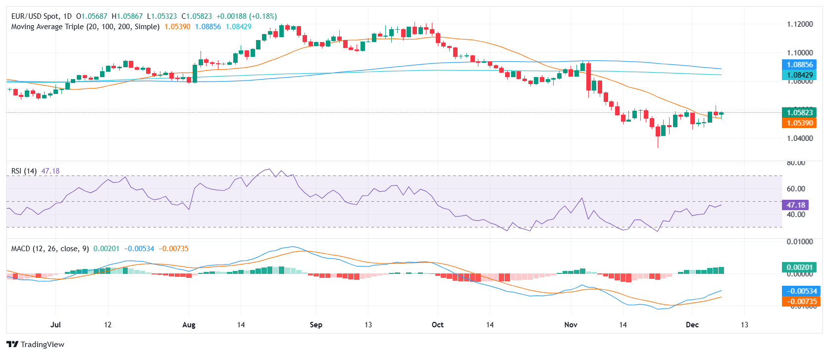 欧元/美元货币对周一呈现温和涨势,在20日均线(SMA)处找到支持后攀升至1.0585。这一反弹加强了 20 日均线作为关键水平的重要性,货币对短期前景保持略微乐观。