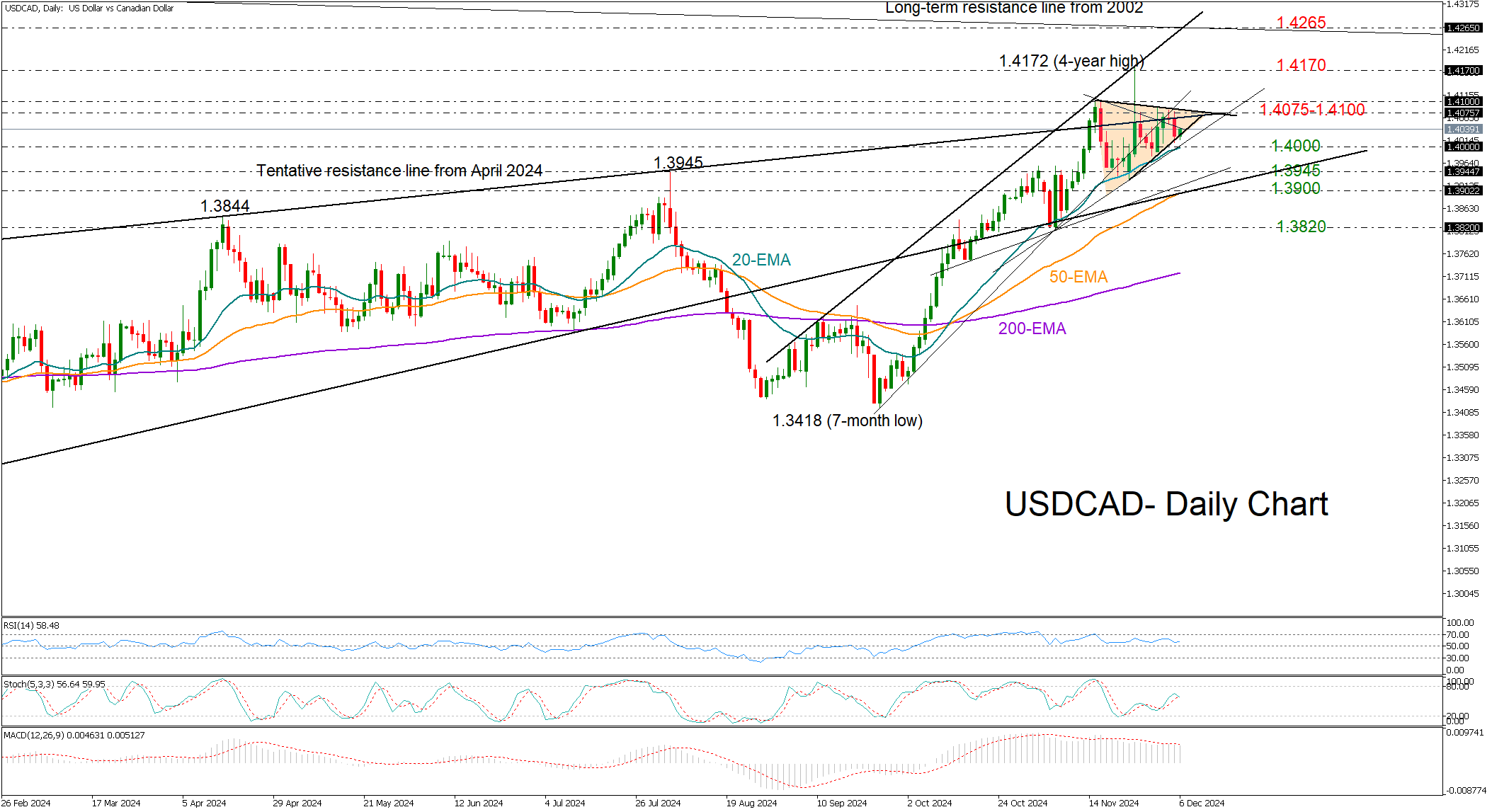 美元/加元在 11 月就业数据公布前保持观望。 看跌压力可能存在,但空头必须收盘于1.40下方 美元兑加元目前盘整,陷入两个月来上升趋势顶部的中性对称三角形中,交易商在美国和加拿大关键就业数据发布前屏