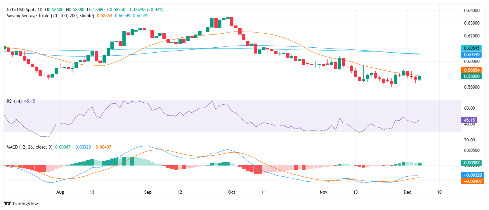 周四,纽元/美元震荡走高,涨幅为0.15%,交投于0.5890附近。尽管出现了这种上行走势,但继续在 20 日均线(SMA)处面临强大阻力,未突破该水平,总体前景继续倾向于下跌。
