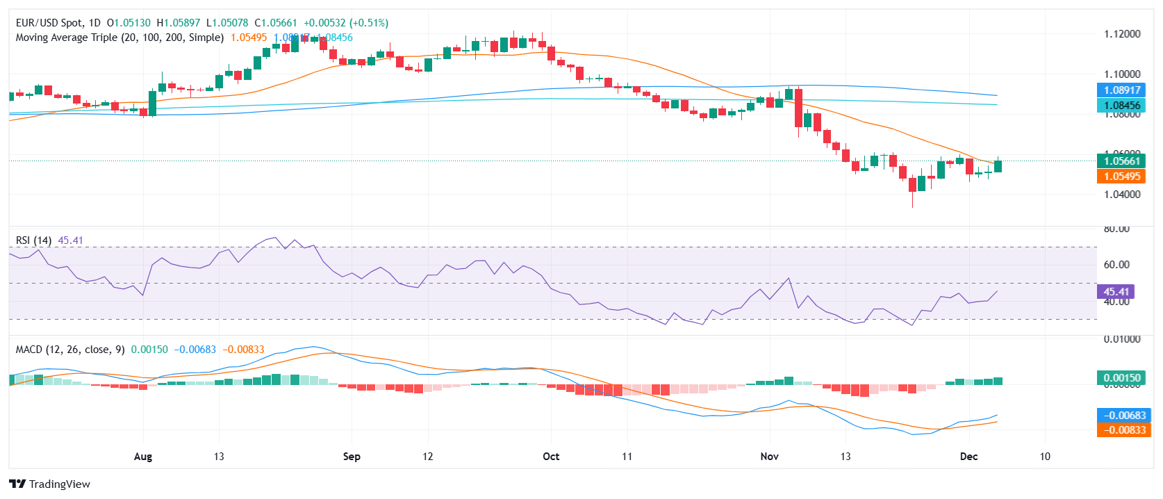 欧元/美元货币对周四延续反弹,升至1.0560,并突破至关键的20日均线(SMA)上方。欧元/美元这一轮波动是继连续两日上涨之后的又一次上涨,多头继周初守住 1.0500 心理支撑后获得了动能。欧元/