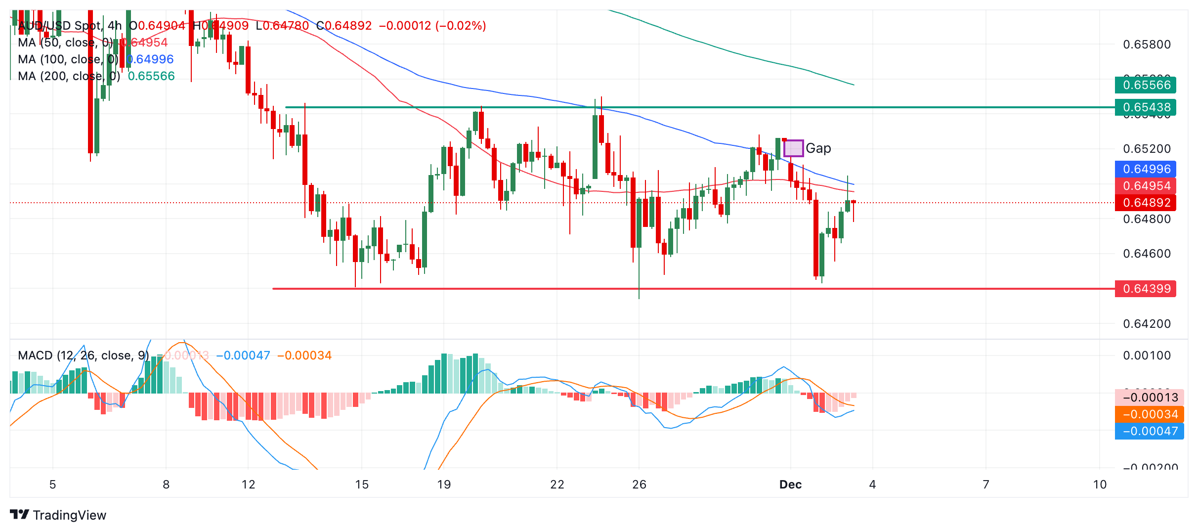 澳元/美元处于上限约 0.6540(绿线)和底部约 0.6440(红线)所包涵的交易区间内。货币对可能处于短期横盘趋势中。