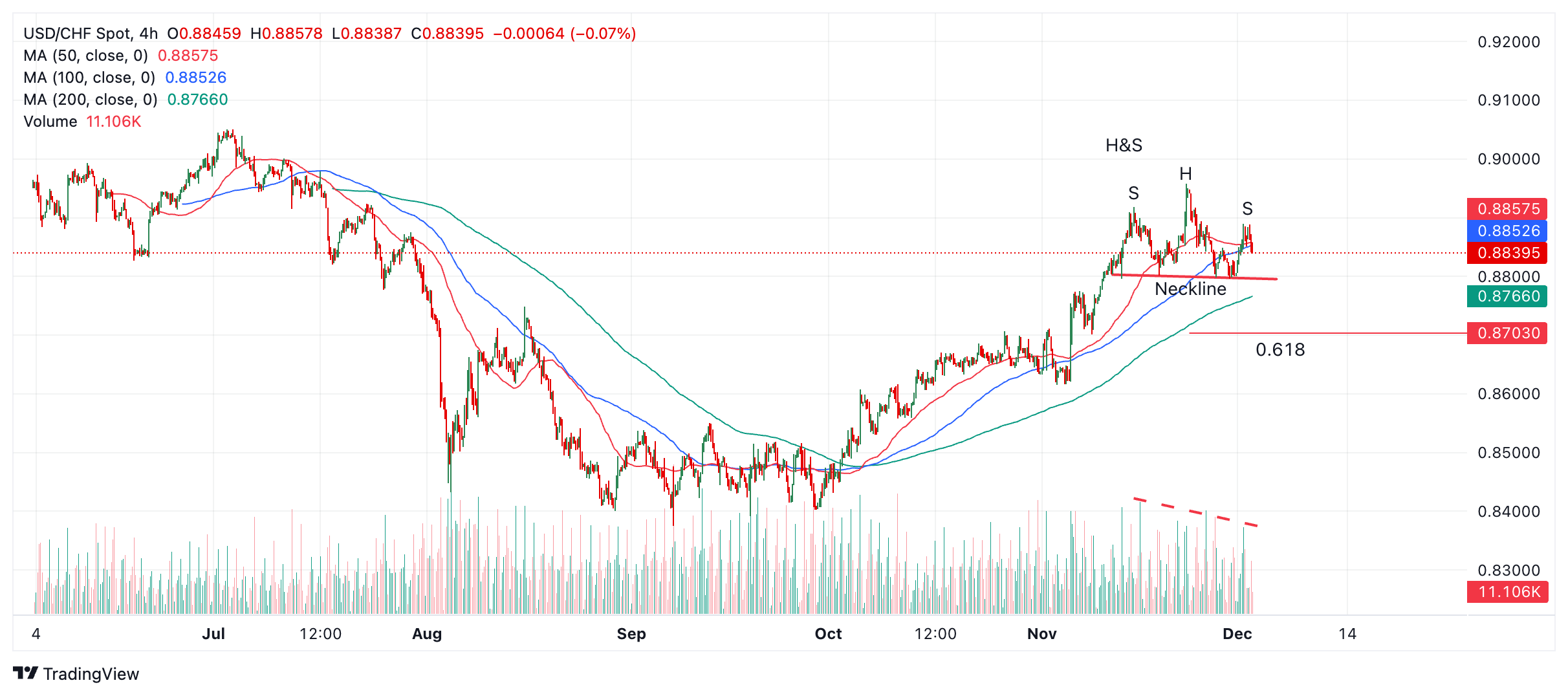 美元/瑞郎价格预测:头肩顶暗示进一步下跌