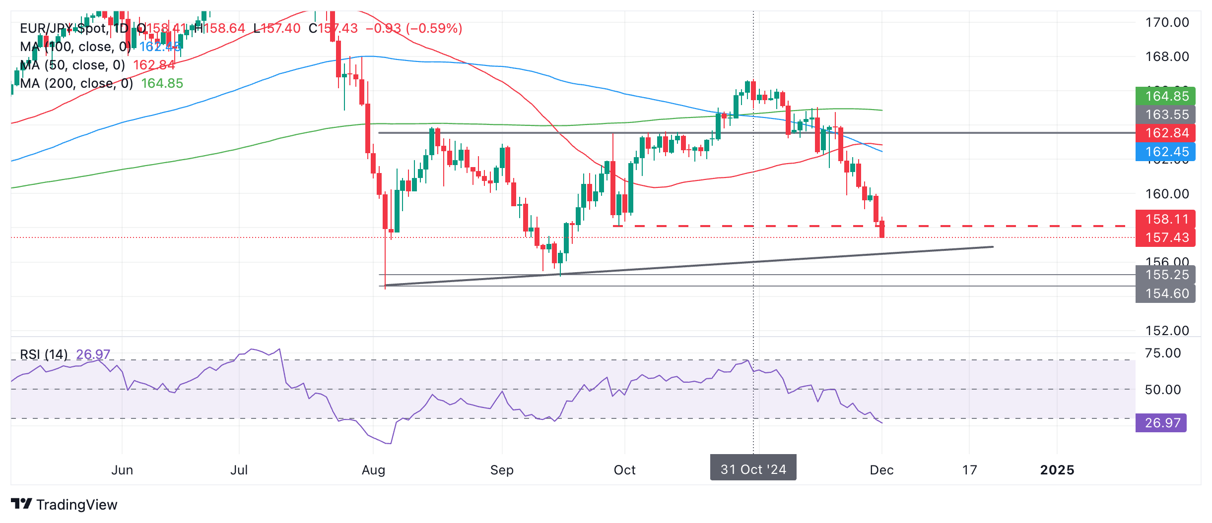 欧元/日元周一延续跌势,但达到超卖水平。该货币对自 10 月 31 日高点以来一直处于中短期下跌趋势中,考虑到技术分析的箴言 "趋势是你的朋友",该货币对有可能出现更多下跌。