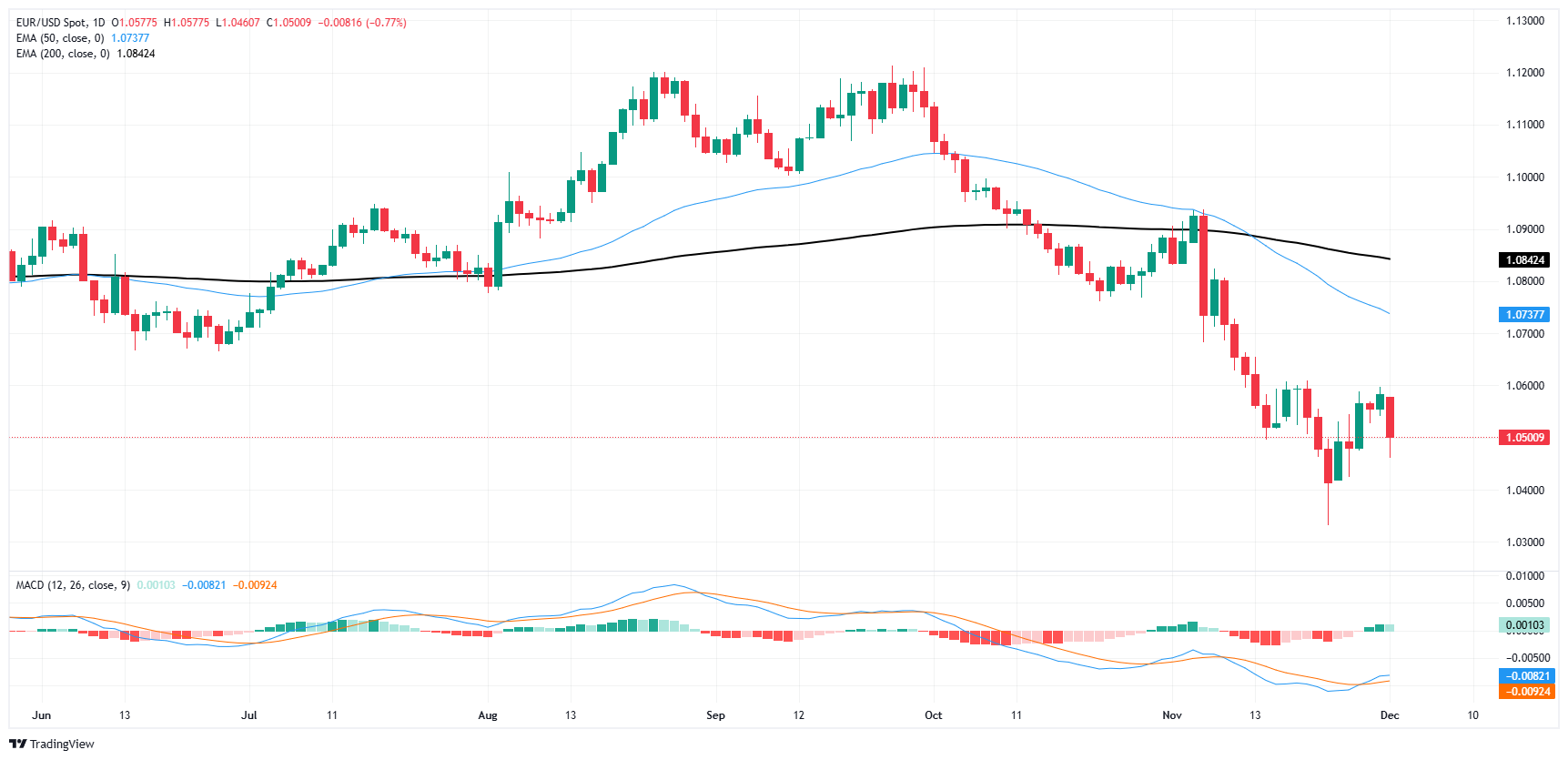 周一开盘,欧元/美元跌回近期震荡区间低位,失守 1.0600 关口,并回落至 1.0500,跌幅接近0.8%。美国采购经理人指数(PMI)数据好于市场预期,但仍低于 50.0 荣枯线处在收缩范围,提振