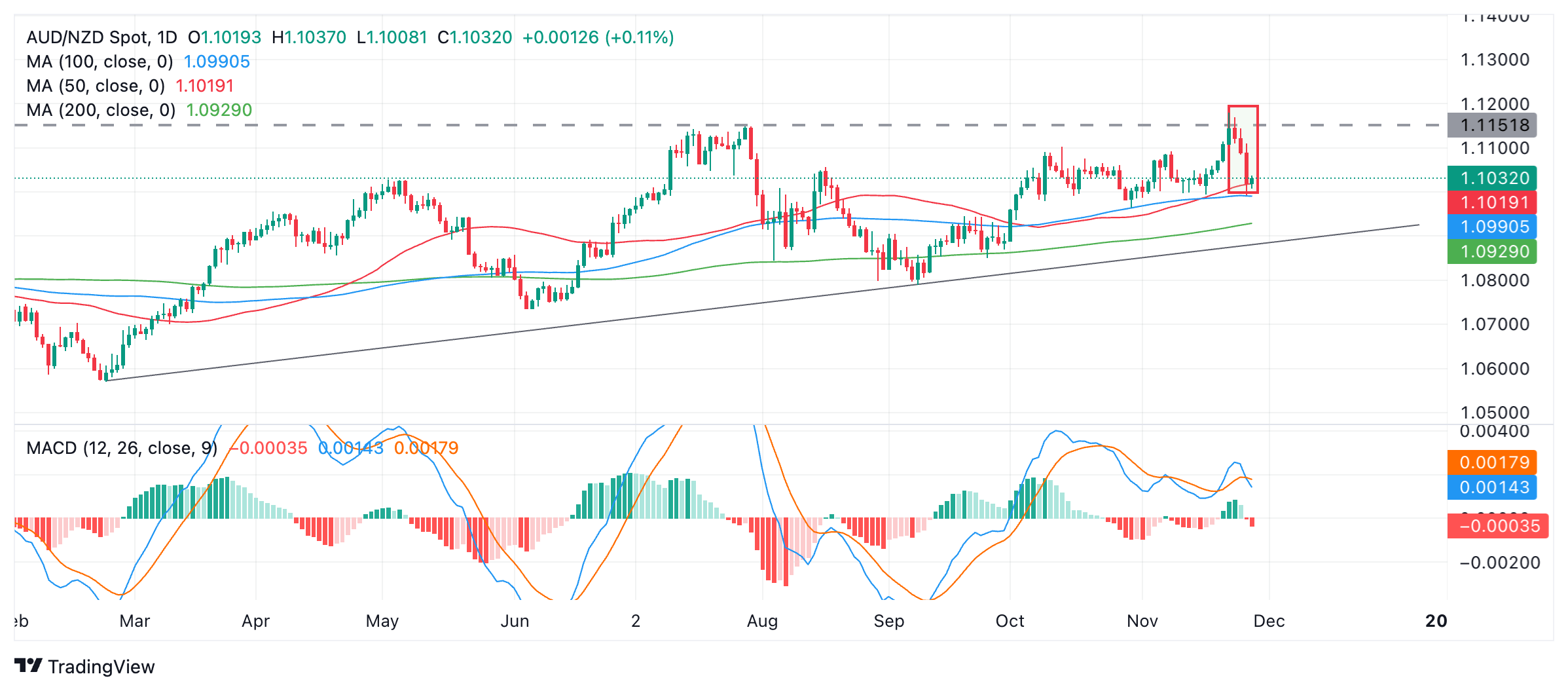 澳元/纽元在 11 月 25 日的多月高点触顶后,已完成三只黑鸦蜡烛图形态(图表上的红色矩形)。