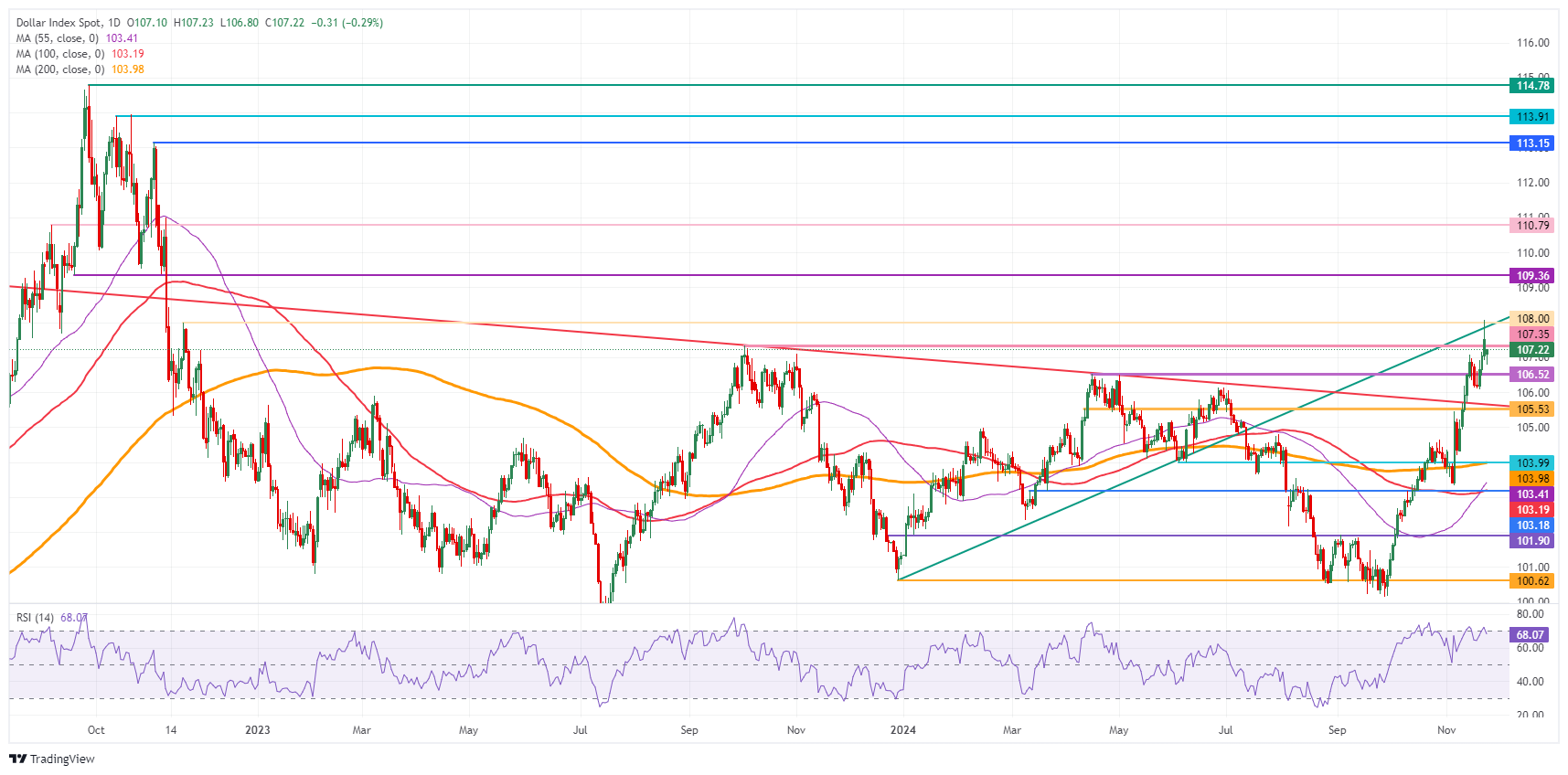 在当选总统唐纳德-特朗普周末确认提名斯科特-贝森特为其即将组建的内阁中的财政部长后,美元(USD)在本周初持平。贝森特被认为是财政鹰派,目标是到2028年预算赤字占GDP的3%,同时表示支持关税和税削