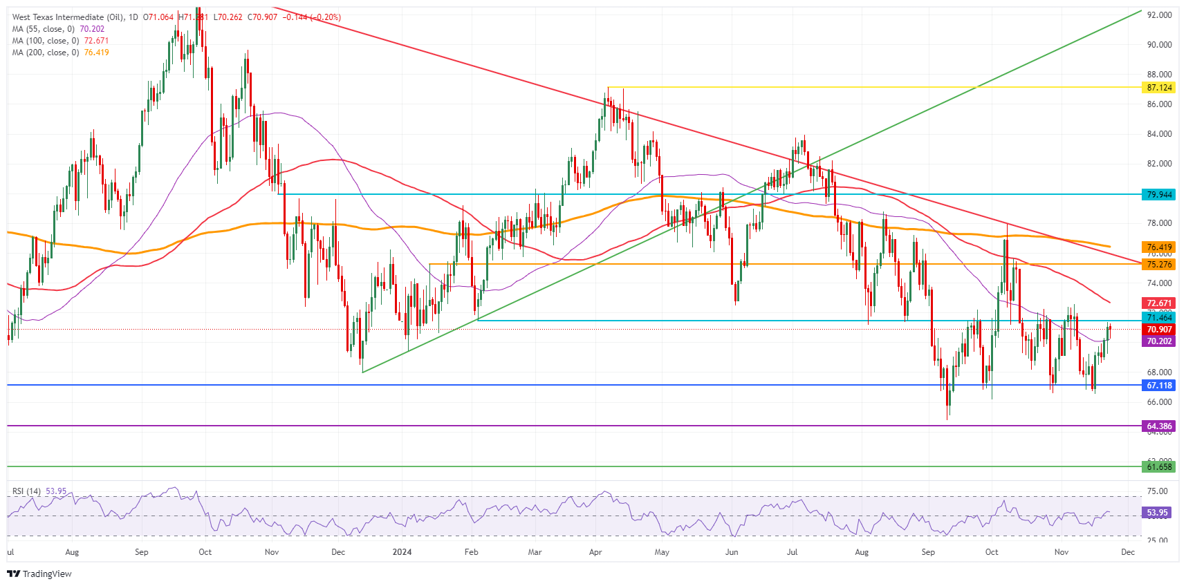 在地缘政治方面较为平静的周末以及美国因感恩节而缩短假期的未来一周之前,原油在周一回落,交投于 70 美元附近。本周的焦点除了来自俄罗斯-乌克兰或中东的任何头条新闻外,将是定于 12 月 1 日星期日举