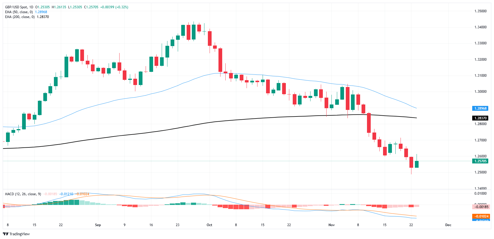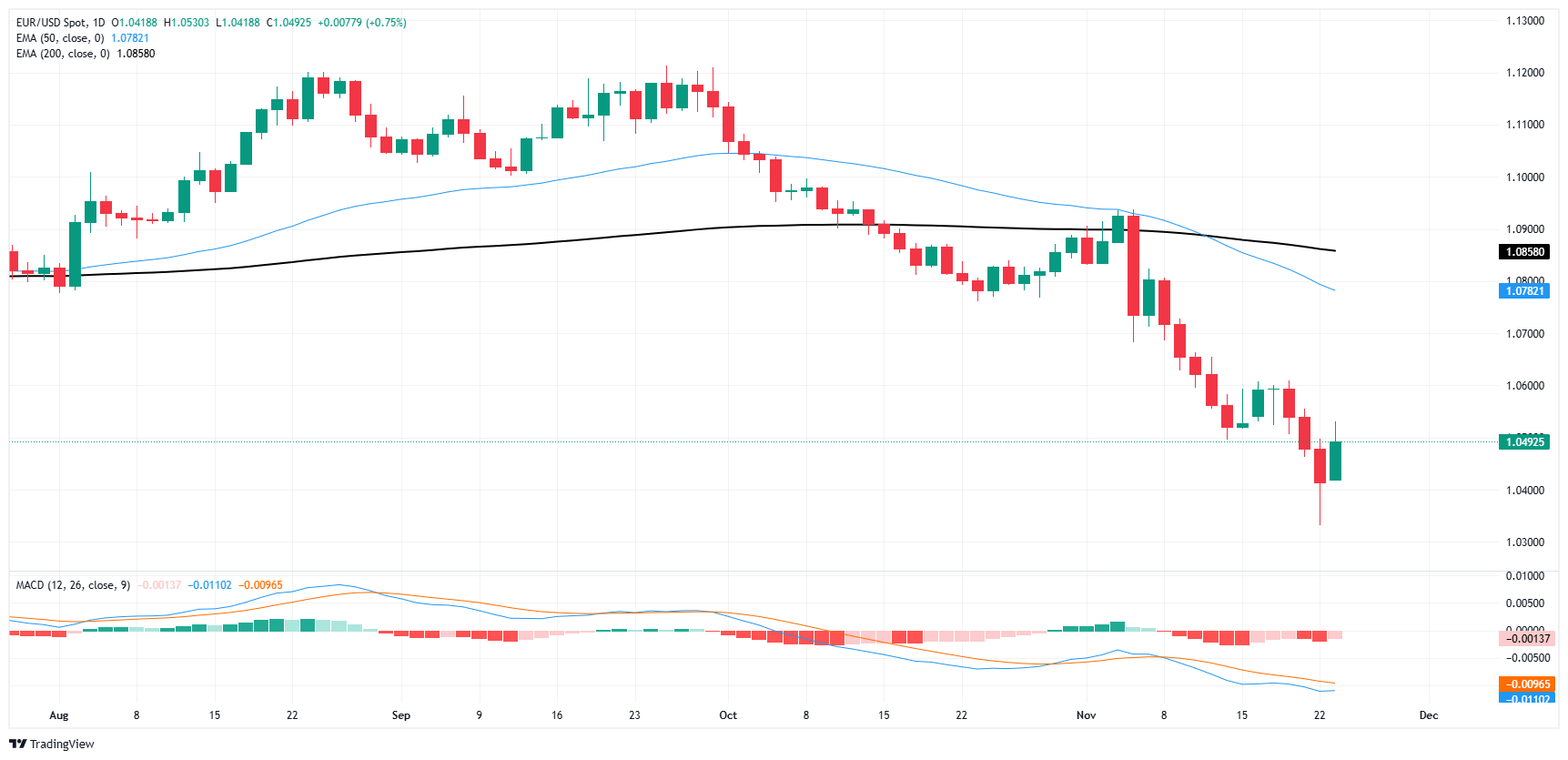 欧元/美元周一试图走高,在投资者重拾风险偏好情绪的背景下,美元全盘下跌,但影响有限,欧元/美元回踩 1.0500 关口。由于周四即将迎来美国感恩节假期,周五市场时间有限,本周后半段的美国市场交易时段流