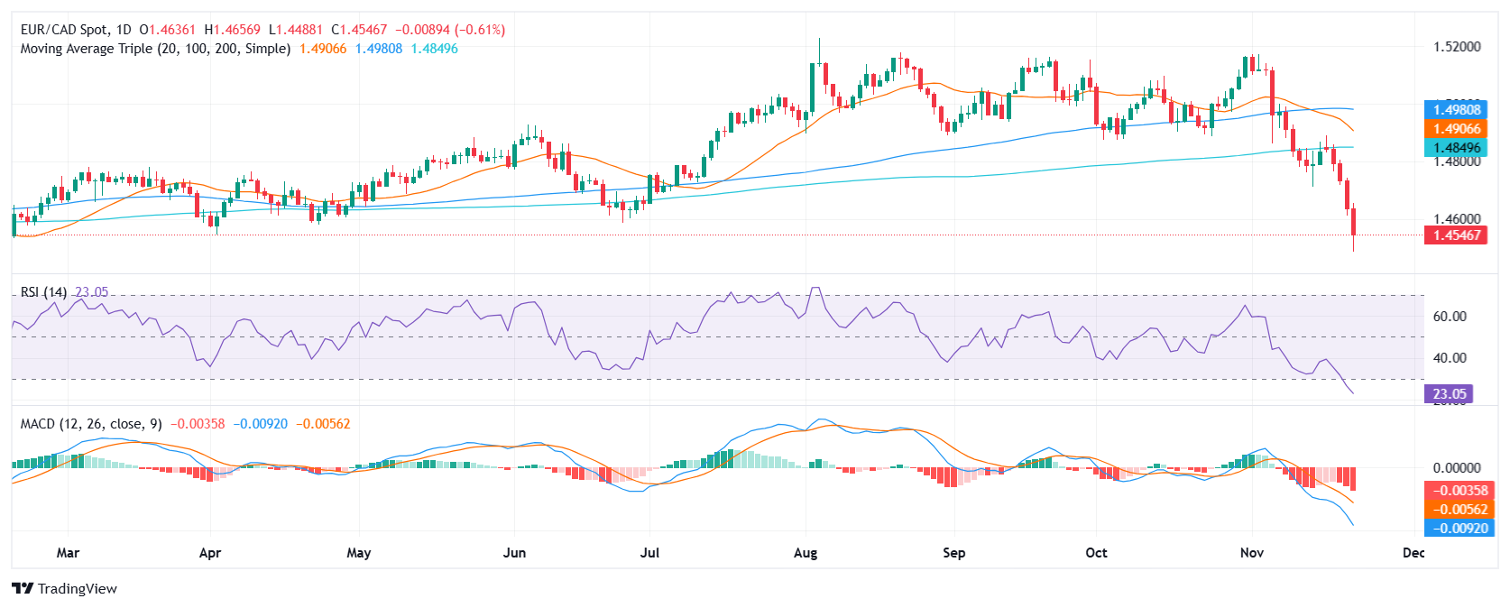 欧元/加元连跌扩大至四个交易日,周五跌至二月份以来低点。该货币对下跌 0.56%,至 1.4550。