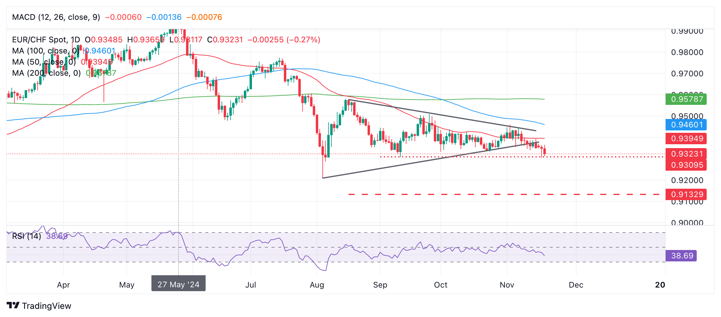 欧元/瑞郎价格预测:确认下行突破三角形形态