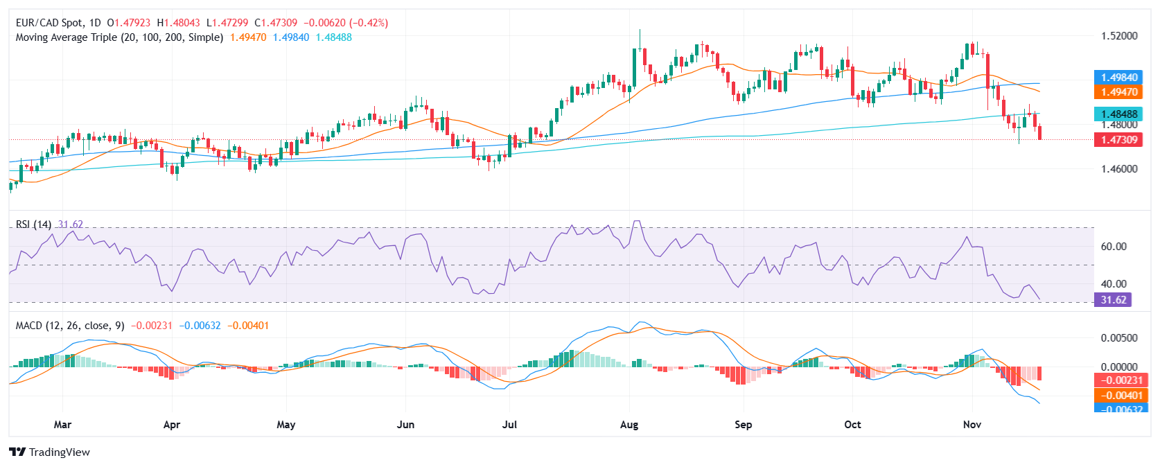 欧元/加元周三下跌 0.29%,最低触及 1.4745,持续下跌并触及 7 月份目前日内低点。看跌的趋势得到了负面技术指标的支持,相对强弱指数(RSI)和移动平均线背离(MACD)显示了看跌压力和看跌