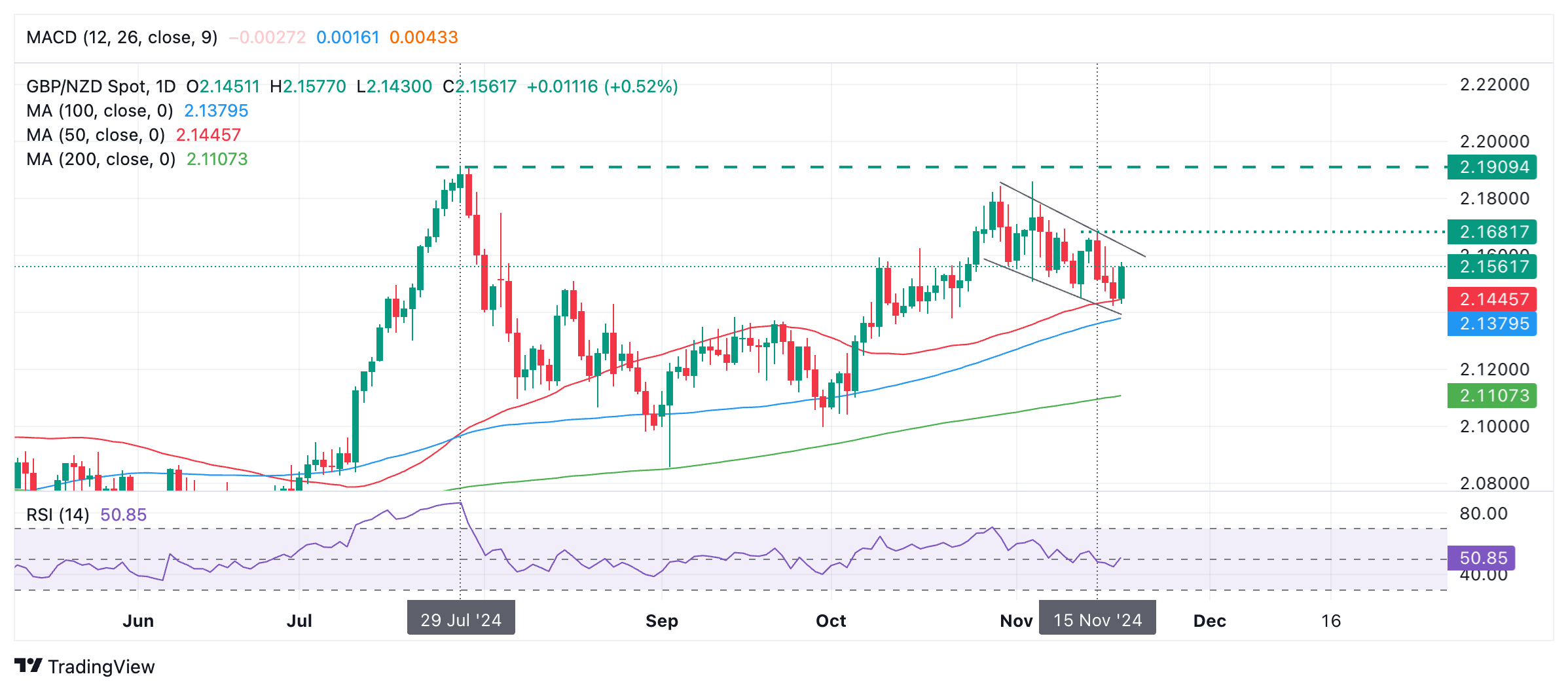 英镑/纽元在 10 月 30 日的高点触顶后,11 月份一直在一个小型通道中修正。目前已触及 50 日均线(SMA)2.1446 的支撑位,并在周三强劲反弹,迄今为止的绿色长蜡烛图就是证明。