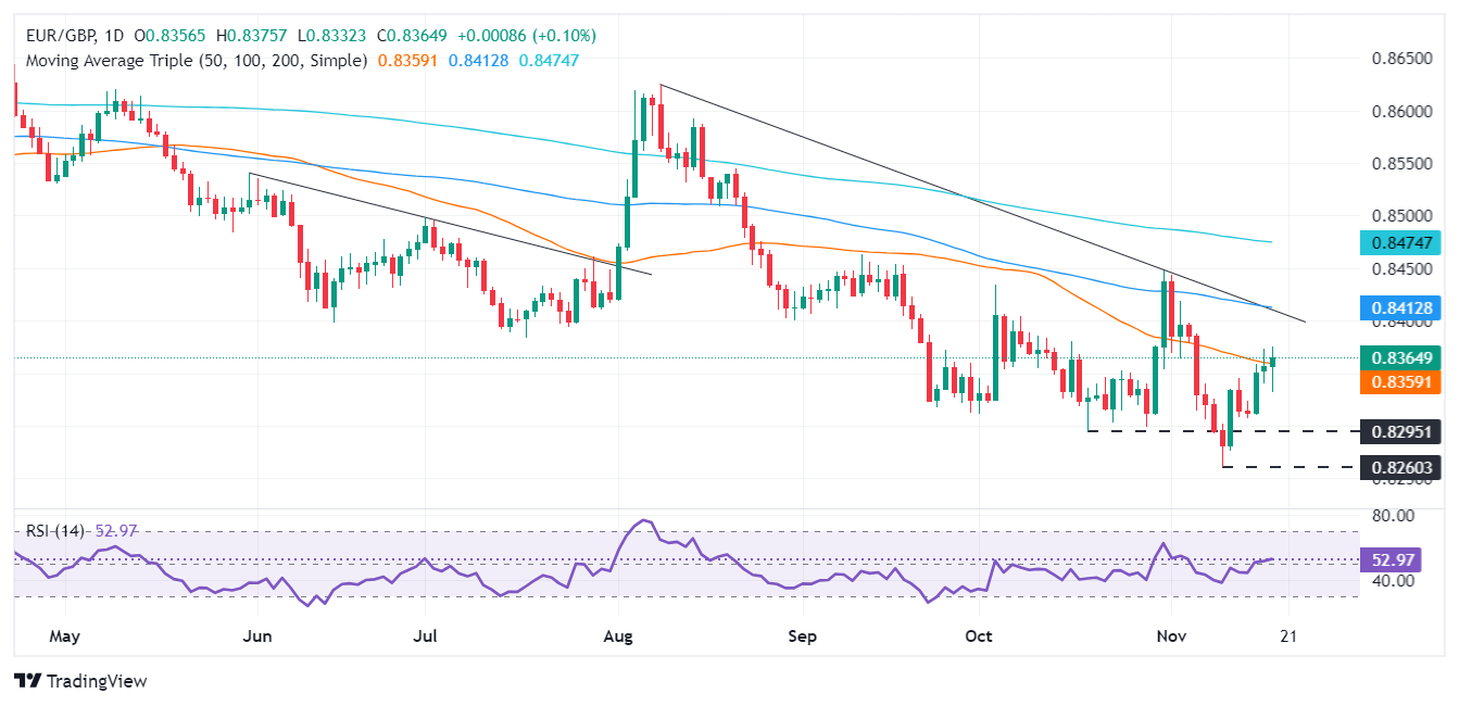 欧元/英镑连续第四日扩大涨幅,走高至50日均线(SMA)上方,截至发稿时为0.8373。