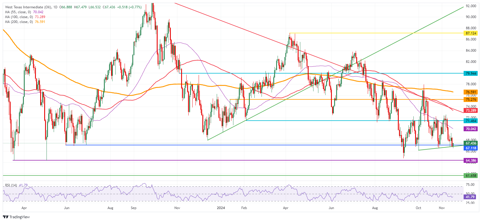 原油价格周一交投于 68.00 美元下方,在周末俄罗斯与乌克兰之间的战争升级后小幅上扬。俄罗斯发动大规模空袭打击乌克兰电网,而美国总统拜登政府允许基辅用远程导弹打击俄罗斯领土。