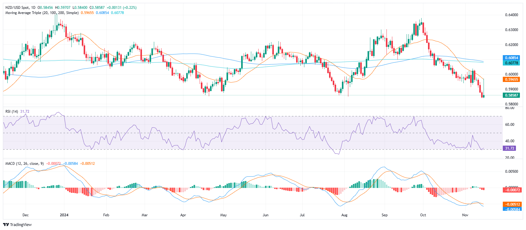 纽元/美元上周五盘中波动剧烈,最初飙升至 20 日均线(SMA)附近的 0.5970 附近的高点,随后跌去所有涨幅,跌向 0.5850。纽元/美元温和上涨至 0.5855,表明多头力量有限,空头持续占