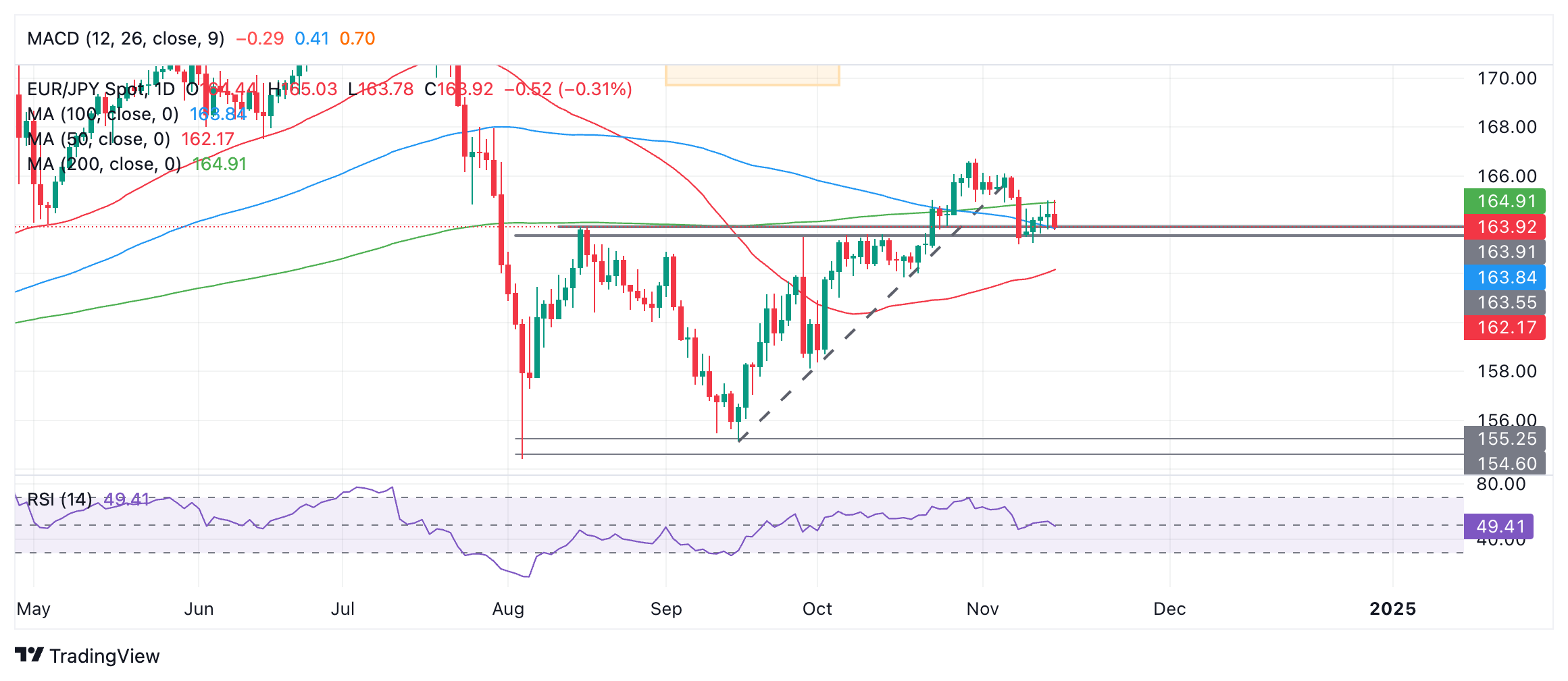 欧元/日元货币对周五出现大幅下跌,跌幅达 0.72%,最低触及 163.10。在此次下跌之前,该货币对在 164.00 均线(SMA)处遇到阻力,促使其下行。