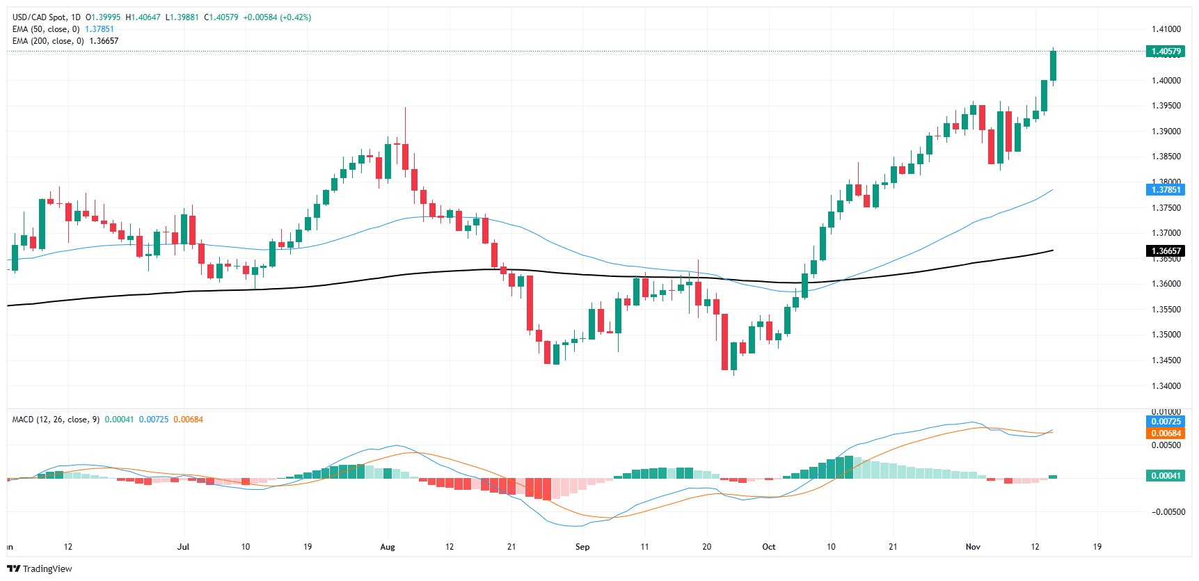 周五亚洲早盘时段,美元(USD)盘整,美元/加元交投于1.4060附近。美国 10 月零售业销售和美联储讲话将成为周五的焦点。 尽管特朗普交易有放缓迹象,但美元持稳于2024年新高附近。美联储官员发