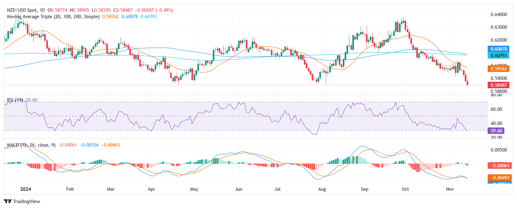 纽元/美元周四盘中下跌0.65%,跌破0.5900关口,连续第六天延续下跌,并创下2023年11月以来新低。看跌动能加剧,出现超卖信号。