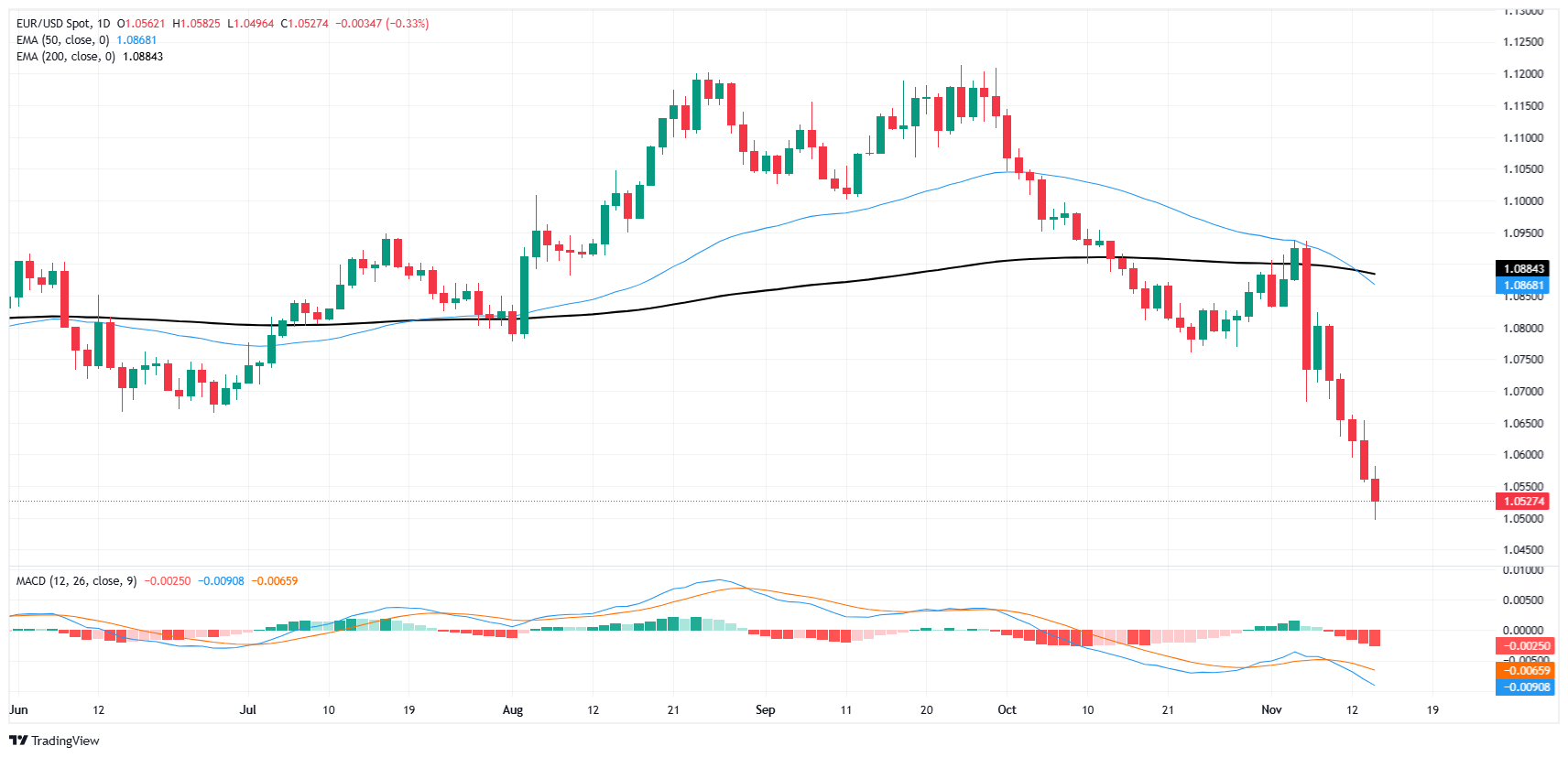 欧元/美元愈一年多以来首次跌破 1.05 水平
