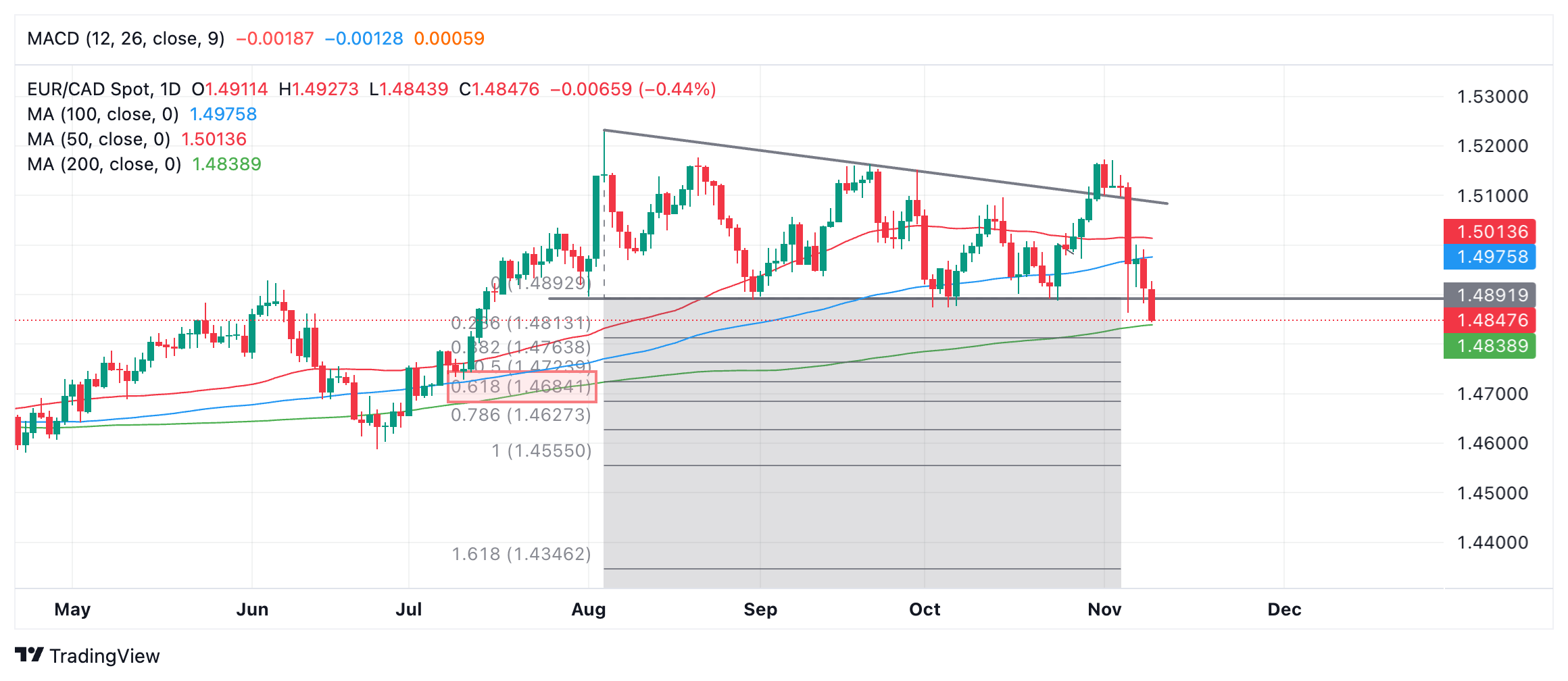 欧元/加元已经跌破了自 8 月份以来形成的矩形价格形态。