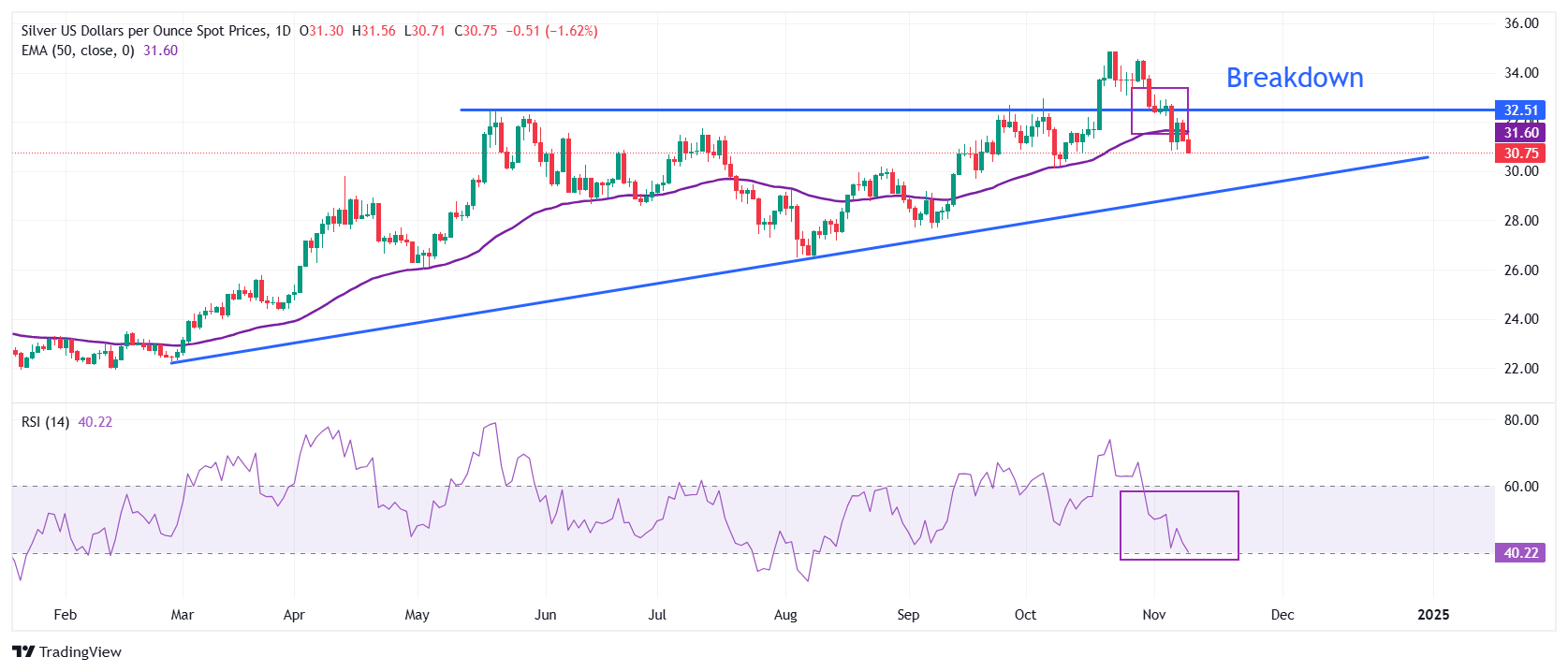 周一北美时段,白银价格(XAG/USD)滑落至关键支撑位 31.00 美元下方。由于对共和党人唐纳德-特朗普(Donald Trump)在美国(US)总统大选中获胜的乐观情绪,美元(USD)上扬,白色
