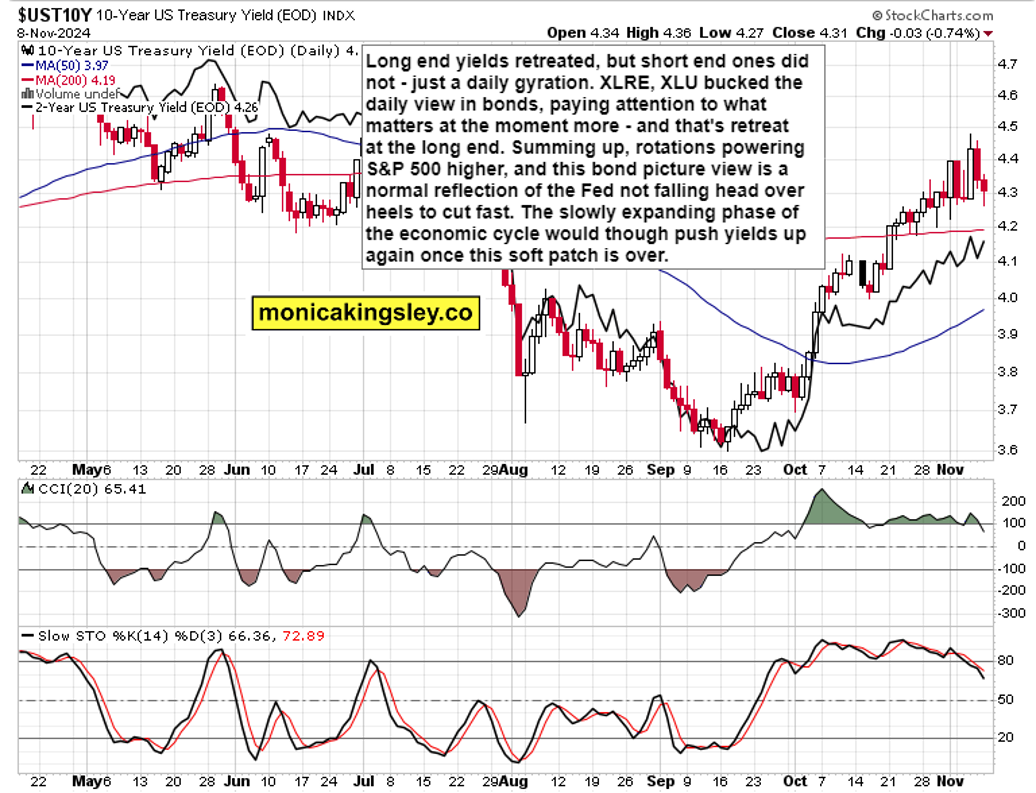 标普 500 指数再次上涨,但债券价格连续第二天上涨,导致投资者轮流做多防御性股票,以及笔者周一挑选的 PLTR 和 TSLA。金融股继续表现良好,工业股是最容易看涨的股票,能源股也有望上涨。WMT