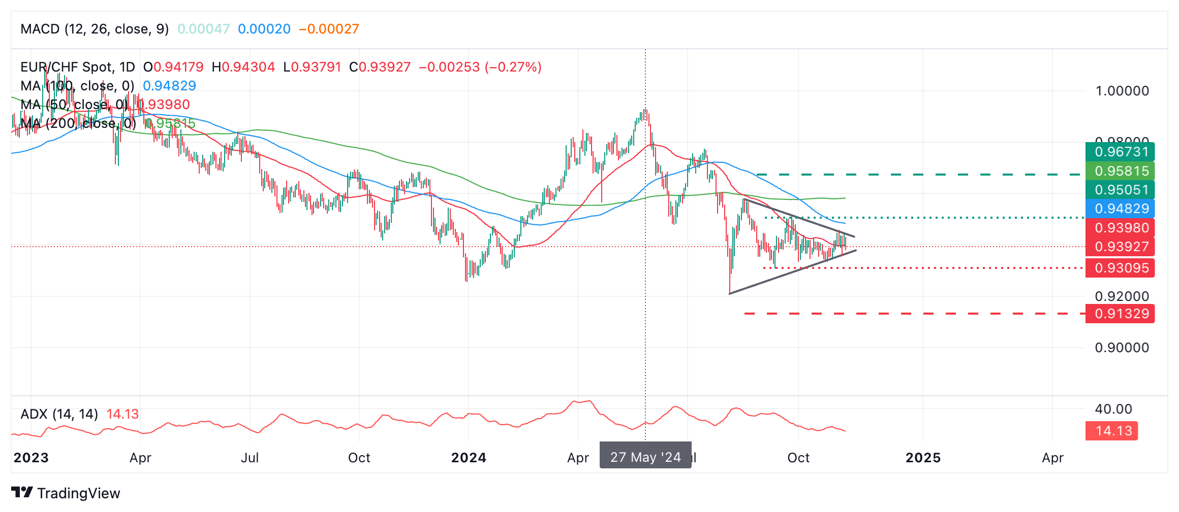 欧元/瑞郎在过去三个月中形成了一个三角形形态,随着该形态逐渐收敛至 0.9400 附近的尖端,该形态似乎即将完成。很快就会突破。