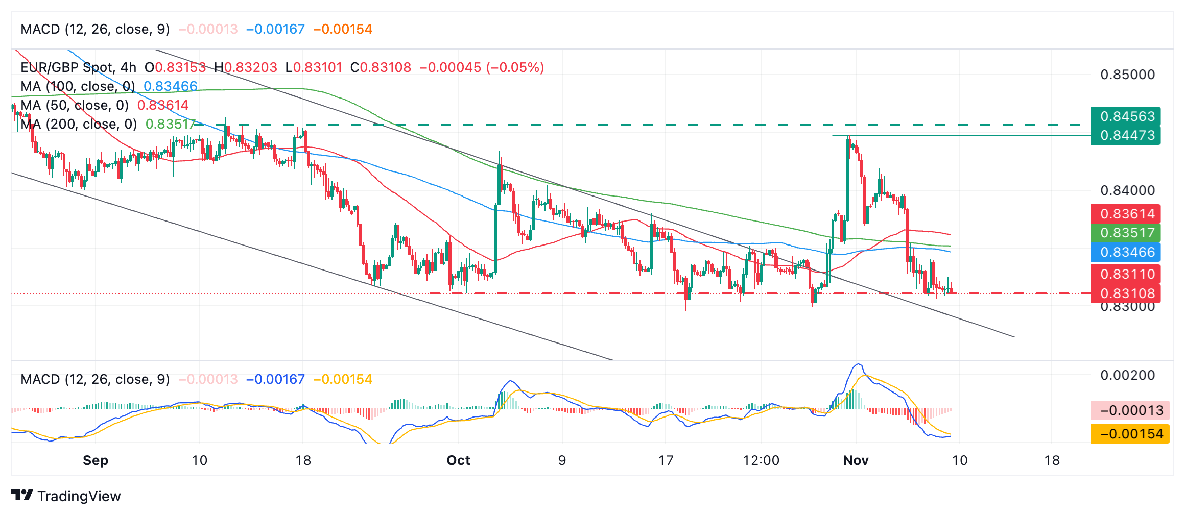 欧元/英镑已下跌至六周区间的底部(折线图上的红色虚线),大致位于 0.8311;它可能在该水平遇到支撑线。
