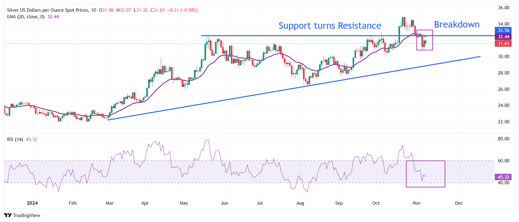 白银价格(XAG/USD)在周五北美时段的回升走势在32.20美元附近遇阻后重启下行走势。由于交易商评估唐纳德-特朗普(Donald Trump)在美国(US)总统大选中获胜对国内和全球化经济的影响,