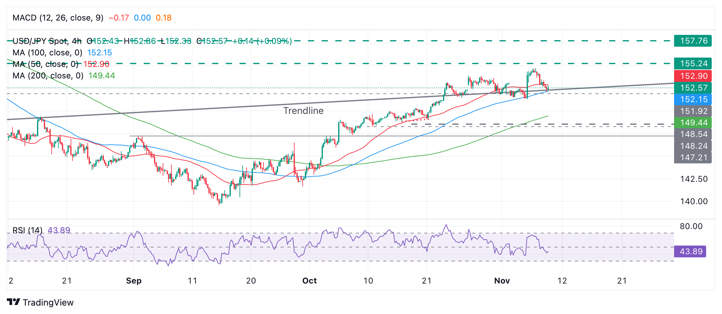 美元/日元回调至长期上升趋势的主要趋势线约 152.55 的支撑位。尽管出现修正,但货币对短期和中期仍处于上升趋势中,鉴于技术分析 "趋势是你的朋友 "的论断,该货币对仍有可能恢复并最终持续走高。