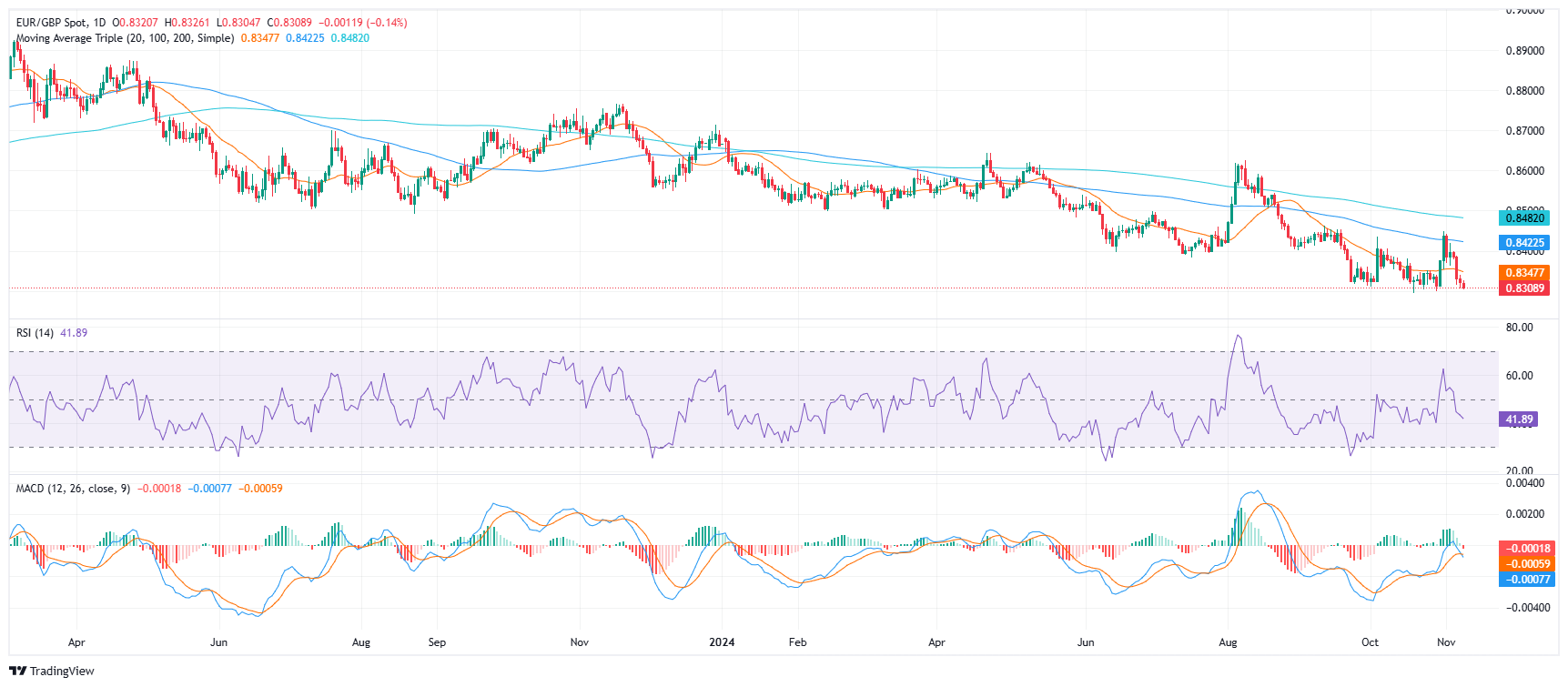 由于卖方持续向下推动,欧元/英镑跌向0.8310,但将在0.8300心理区域面临强劲支持。 该货币对一直处于下行轨道,跌破 20 天 SMA 并触及多周低点。相对强弱指数(RSI)和移动平均线背离(M