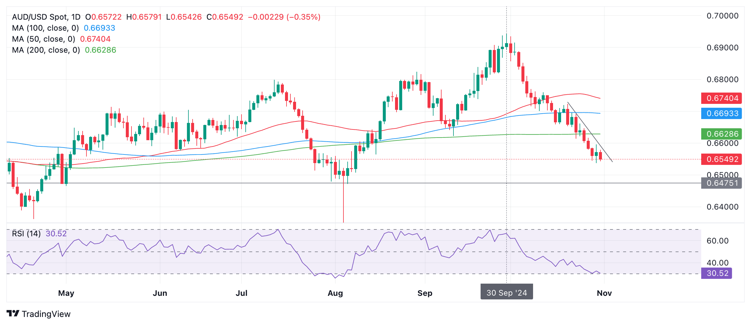 澳元/美元在短暂回调后延续十月的跌势。该货币对处于中短期下跌趋势中,鉴于 "趋势是你的朋友 "这一技术格言,该趋势很可能向下延伸。