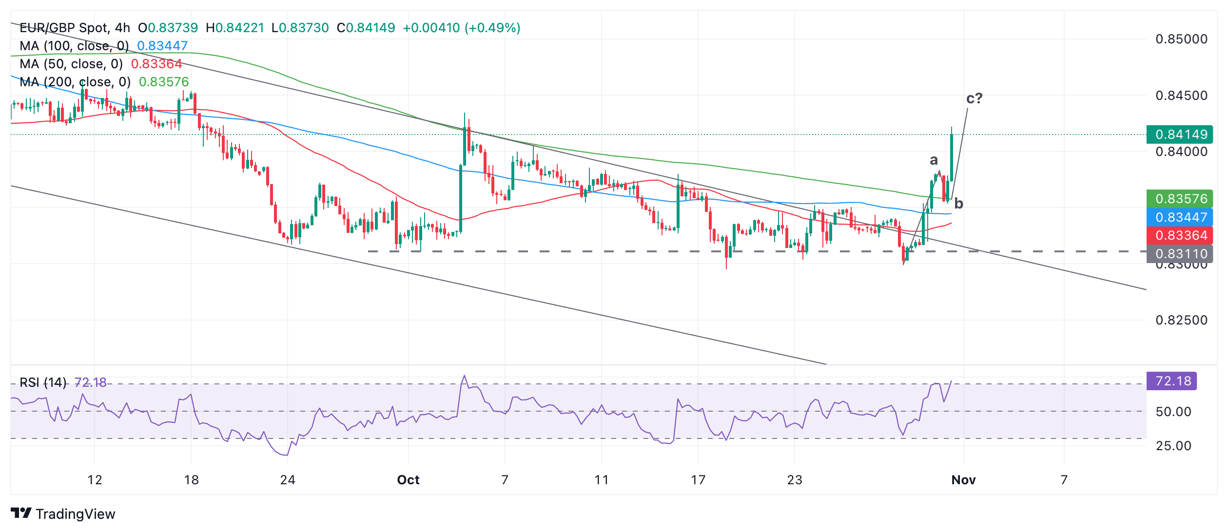 欧元/英镑从多年低点的关键支持线(灰色虚线)反弹,周四升逾一个百分点,交投于 0.8400 以上。