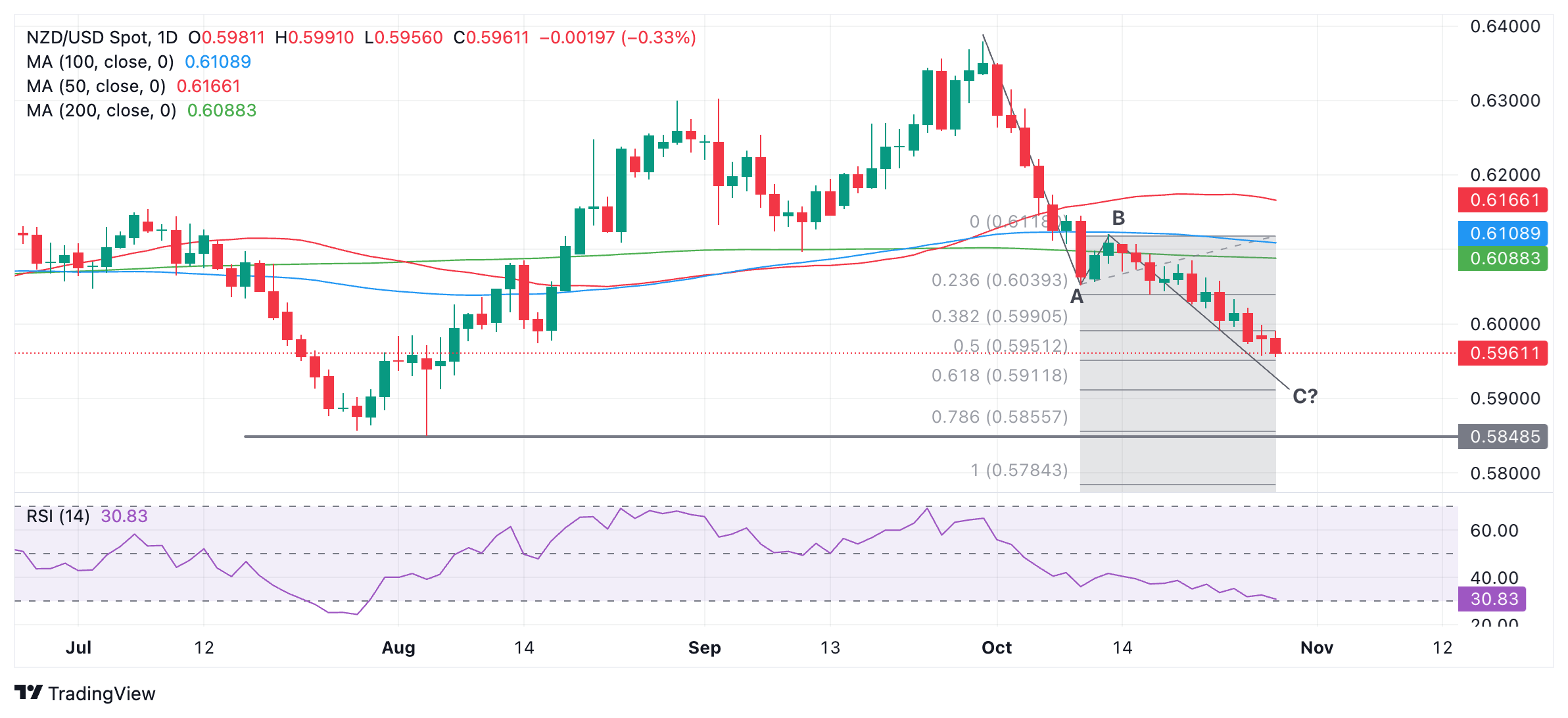 纽元/美元正在下跌,可能是看跌 ABC 形态的 C 浪,该形态始于 9 月 30 日的高点。 ABC 是 "之 "字形形态,其中 A 浪和 C 浪的长度通常相近,或为另一浪的 61.8% 斐波那契。