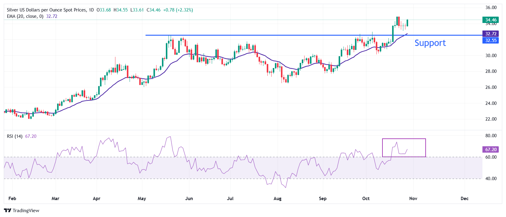 白银价格(XAG/USD)在周二的北美时段发现了强劲的买盘兴趣,因为美国劳工统计局(BLS)报告了一组疲软的9月份JOLTS职位空缺数据。由于疲软的职位空缺数据表明就业市场放缓,白色金属延续上扬至34
