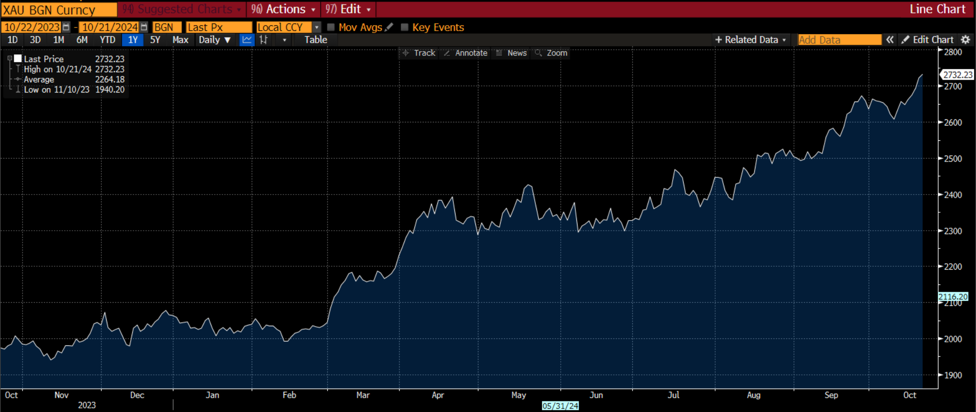 周一美国时段,黄金价格再创新高,然而在美国国债收益率升高和美元走强的情况下,金价暂停了上涨。中东地区紧张局势和美国总统大选前景不明朗在过去五个交易日中增加了避险资产的流动。截至发稿时,黄金/美元报收于