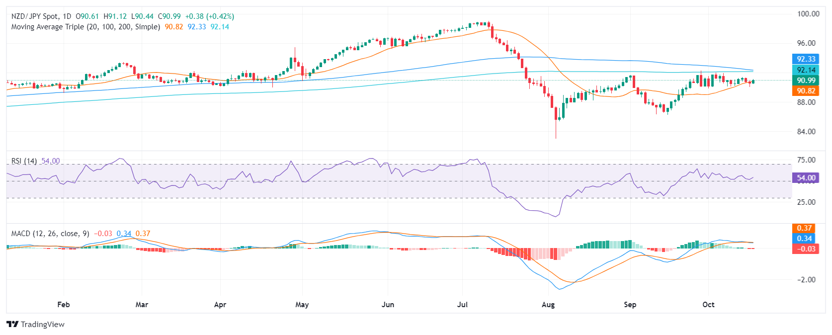 周四盘中,纽元/日元上涨 0.45% 至 90.95,持续了过去几个交易日的盘整走势。