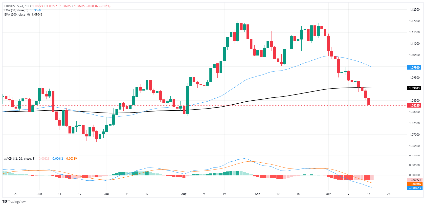 欧洲央行(ECB)周四早些时候降息25个基点后,欧元/美元持续回落。由于缺乏看涨者动能,欧元/美元扩大了近期跌幅,与 9 月底略高于 1.1200 的高位相比,跌幅超过 3.5%。